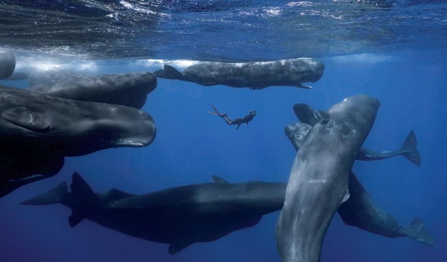Patrick Dykstra inmitten einer Gruppe von Pottwalen. Der Film „Patrick and the Whale“ begeistert mit unglaublichen Unterwasseraufnahmen und einer berührenden Geschichte zwischen einem Menschen und den riesigen Meeressäugetieren.