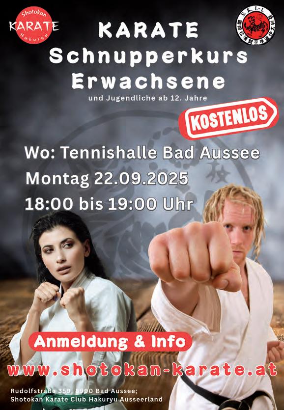 Der Saisonstart im Dojo Bad Aussee erfolgt nach Schulbeginn am Mittwoch, 10. September, im Turnsaal der Volksschule Bad Aussee. Informationen zum Training und Kontakt können gerne auf der Homepage www.karate.at/salzkammergut abgerufen werden.