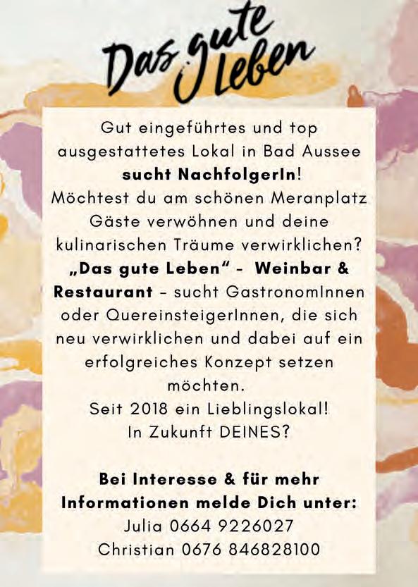 E-mail: redaktion@alpenpost.at Für den Inhalt verantwortlich: Florian Seiberl. Druck: Druckerei WALLIG, 8962 Gröbming. Erscheinungsweise: 14-tägig. Einzahlungen auf das Konto AT764501030400030000 bei der Volksbank Salzburg. Aufgrund der Lesbarkeit der Artikel wird bei Bedarf nur eine Geschlechtsform gewählt. Dies bedeutet jedoch keine Benachteiligung des anderen Geschlechtes. Die mit ß versehenen Artikel sind bezahlte Anzeigen. Die Redaktion behält sich das Recht vor, zugesandte Leserbriefe zu kürzen und übernimmt keine Haftung für den Inhalt kostenloser Ankündigungen. Alle Rechte vorbehalten. Druck- und Satzfehler vorbehalten.