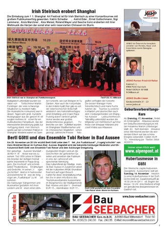 grafen verfolgten die Konzerte. Die beiden Manager Hans Simentschitsch und Hans Fuchs nutzten die Tournee zu vielerlei Kontakten und überreichten auch dem V izebürgermeister von Shang hai Ausseer Lebkuchenherzen. Tatkräftig unterstützt wurden die Mitglieder von IrishSteirisch auf ihrer Reise vom Ehepaar Hillbrand und Josef Khälss aus Altaussee.