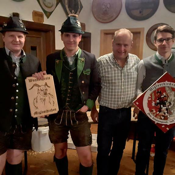 Hammer, Meißel, Zangen …), um sie zu öffnen und das Rundherum ziemlich zu versauen. Beim Schießen selbst war es ernsthafter zugegangen, was für gute Ergebnisse sorgte: Herrenwertung: Josi Wimmer (46), Ludwig Fischer (45/45) und Dietmar Hillbrand (45). Damenwertung; Andrea Dattendorfer (30), Vroni Brandauer (29/26) und Eva Enzelberger (29/24). Die Tiefschusswertung gewann Sebastian Kainzinger mit 86 Teilern, gefolgt von Fabian Fuchs (230 Teiler) und Franz Pichler (386 Teiler). Die MigloScheibe mit Nadeln als Preise gewannen Michael Machherndl, Sebastian Kubisch und Georg Leu. Zum Schluss wurde wieder der Wanderpreis des Migloschießens vergeben: wie schon beim letzten Mal an die Miglo-Pass aus Grundlsee (123). Auf dem zweiten Platz folgten die Passen aus Puchen (121) und Lichtersberg (103). Man hofft auf eine solche Veranstaltung im nächsten Jahr - und vier Passen freuen sich auf Revanche!