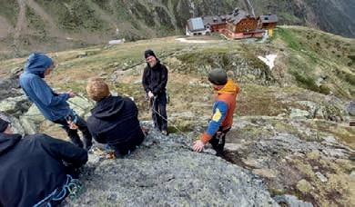 Der erste Nachmittag, den wir mit dem Üben von Abseilen, Knotenkunde und Sicherungstechniken in der Nähe der Hütte verbringen, ist dann auch noch eher kühl. Konsequenterweise treffen wir noch die letzten Skitourengeher der Saison bei ihrem Abstieg von der Wildspitze, die allerdings die etwas weichen Schneeverhältnisse kritisieren. Ok. Immerhin ist Juni…