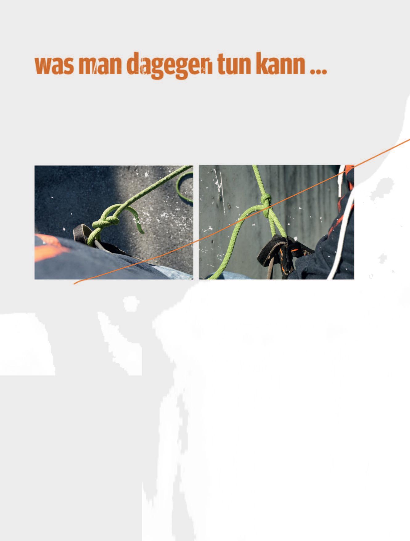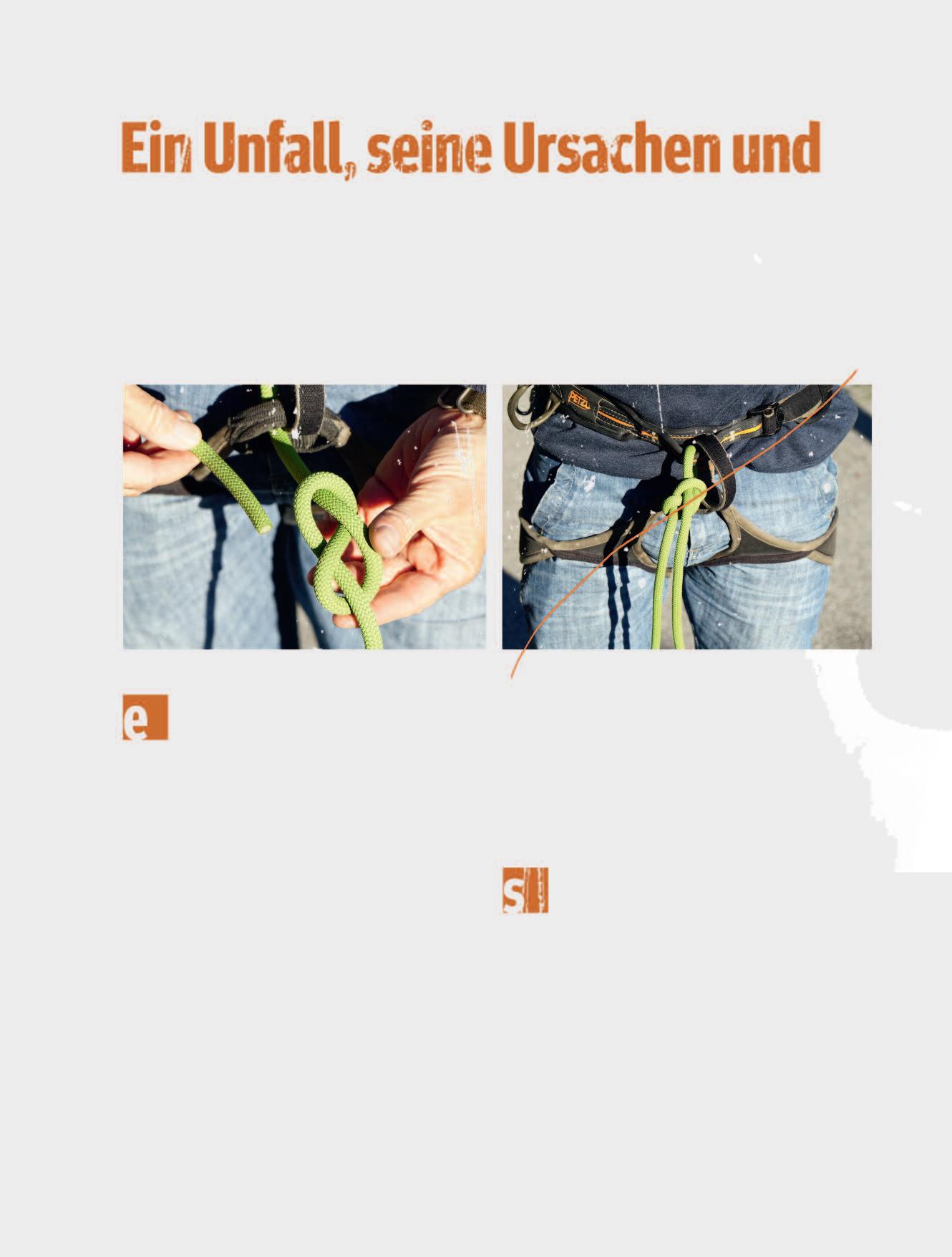 Michael Larcher und Markus Schwaiger stellen die Lehrmeinung des ÖAV zum Partnercheck in der Kletterhalle vor, bevor sich Kollege Würtl in „Ein Unfall, seine Ursachen und was man dagegen tun kann“ ausgehend von einem halbfertigen Anseilknoten seine Gedanken zu Fehlern macht