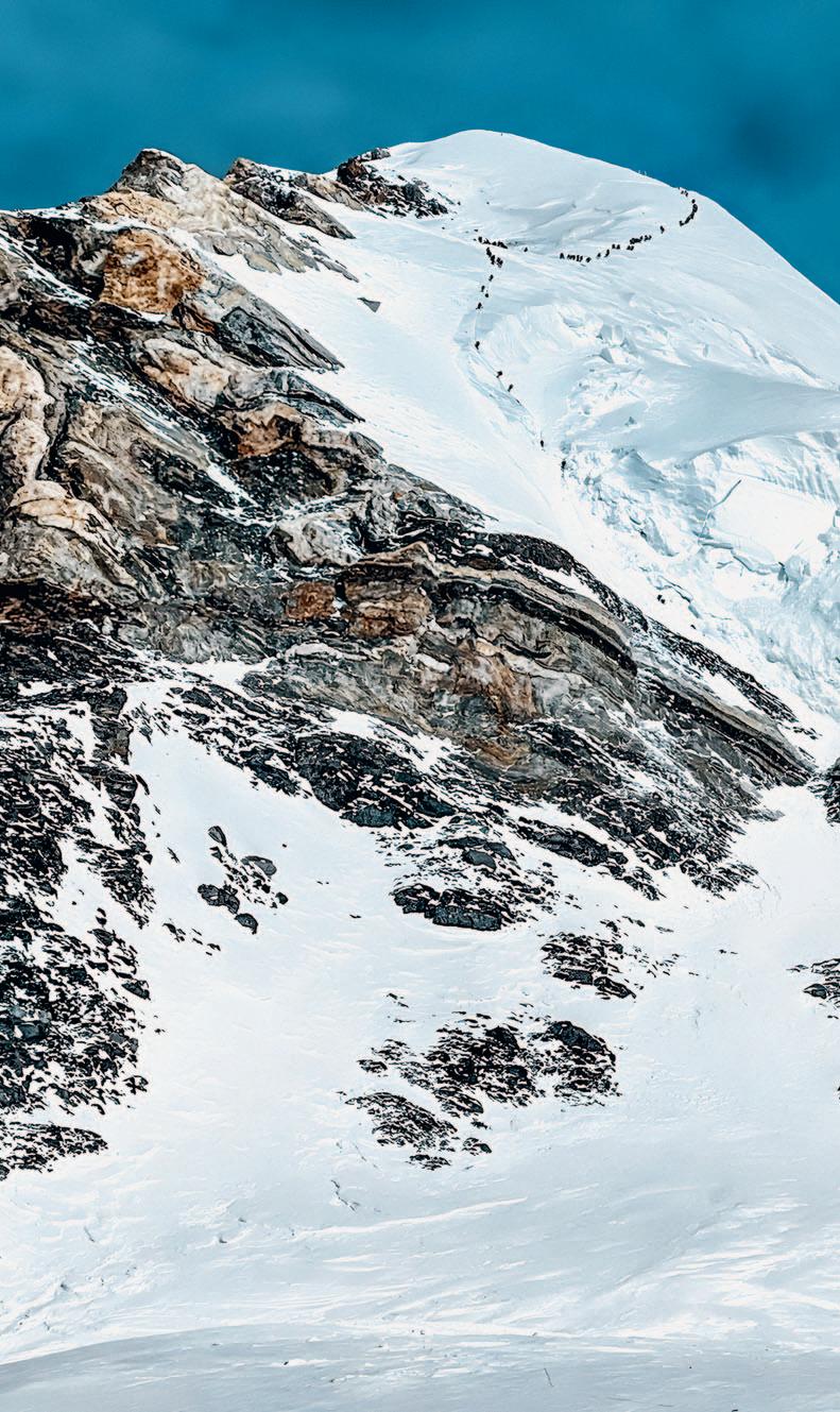 Lange galt der K2 als zu gefährlich für kommerzielle Expeditionen und war daher nur erfahrenen Alpinisten vorbehalten. „Ich schrieb in einem Blogartikel 2016, dass der K2 niemals zum Mount Everest wird. Ich habe mich geirrt.“ So der K2-Besteiger und Achttausenderchronist Alan Arnette, nachdem am 22. Juli 2022 145 Menschen den Gipfel des K2 erreicht hatten – so viele wie zwischen 1954, dem Jahr der Erstbesteigung, und 1996. Das Bild wurde von Kristin Harila (siehe bergsönlichkeit) im Abstieg mit dem Handy aufgenommen und hat daher keine gute Qualität. Die Menschenkette oberhalb des Flaschenhalses, der Schlüsselstelle des K2, ist aber dennoch gut zu erkennen.