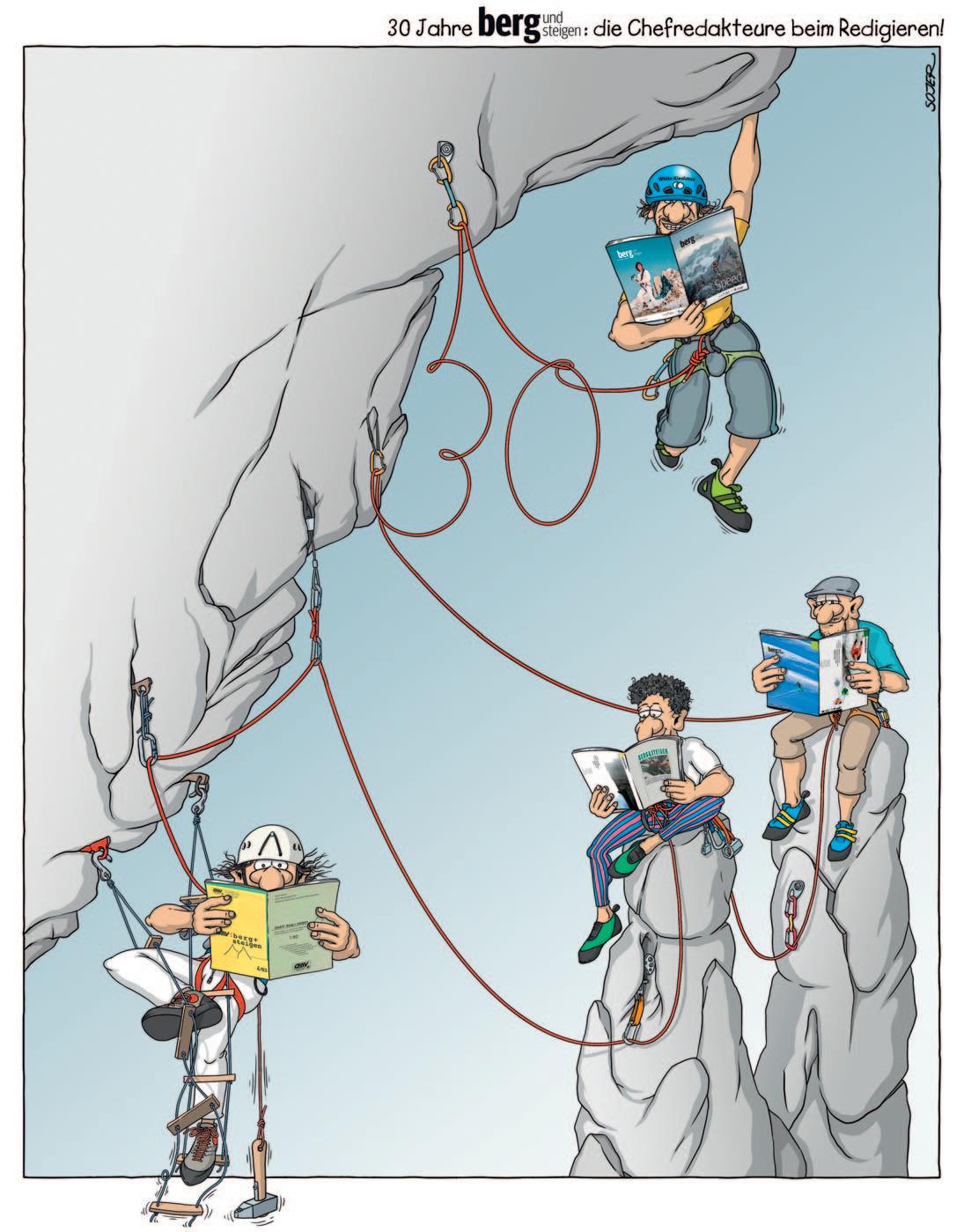 1) „Und jedem Anfang wohnt ein Zauber inne.“ Der Zauber am Anfang von bergundsteigen lag in einer Mischung aus Unbekümmertheit, Ehrgeiz, Leidenschaft – ich brannte für das Thema Alpinausbildung – und einer einfachen Zielvorgabe meines Chefs, Robert Renzler: Das Bergsteigen im ÖAV müsse wieder in den Mittelpunkt rücken. Gerade einmal einen Monat im Dienst stand mein Entschluss fest: Wir machen eine Zeitschrift mit dem Fokus auf Ausbildung und Sicherheit, viermal jährlich, speziell für unsere Lehrwarte in den Sektionen und Ortsgruppen. Im Sommer 1992 erschien das erste berg+steigen in einer Auflage von 1200 Stück. Der ÖAV hatte damals 233.000 Mitglieder. 2) Mit unserem Themenschwerpunkt hatten wir eine Nische getroffen. Da gab es einen Hunger nach Information, der war gewaltig –auch jenseits der Vereinsgrenzen. Zwar gab es Lehr- und Jahrbücher, was aber fehlte, war ein periodisch erscheinendes Magazin zur Sicherheit im Bergsport. 1999 wurde bergundsteigen als Abo erhältlich und bekam den Untertitel „Zeitschrift für Risikomanagement im Bergsport“. Peter Plattner! Der junge Bergführer stößt 1995 dazu und wird die Entwicklung bis 2019 maßgeblich mitgestalten, als Experte, freier Mitarbeiter, zuletzt Chefredakteur. Kompetent und treu an seiner Seite der Alpinwissenschaftler Walter Würtl. 3) Heute ein Alleinstellungsmerkmal von bergundsteigen, erschien es zunächst nebensächlich für eine Fachzeitschrift – die Form, Layout und Design. Die Grafikerin (und Alpinistin) lernten wir 2003 auf einem Instruktorenkurs kennen. Christine Brandmaiers stetes Ringen um die beste Form ist bis heute ein Spiegel der Ernsthaftigkeit unseres Inhalts, des Ringens um Lehrmeinung, um die beste Technik und Strategie. Fast immer geht es um Überlebenskonzepte.
