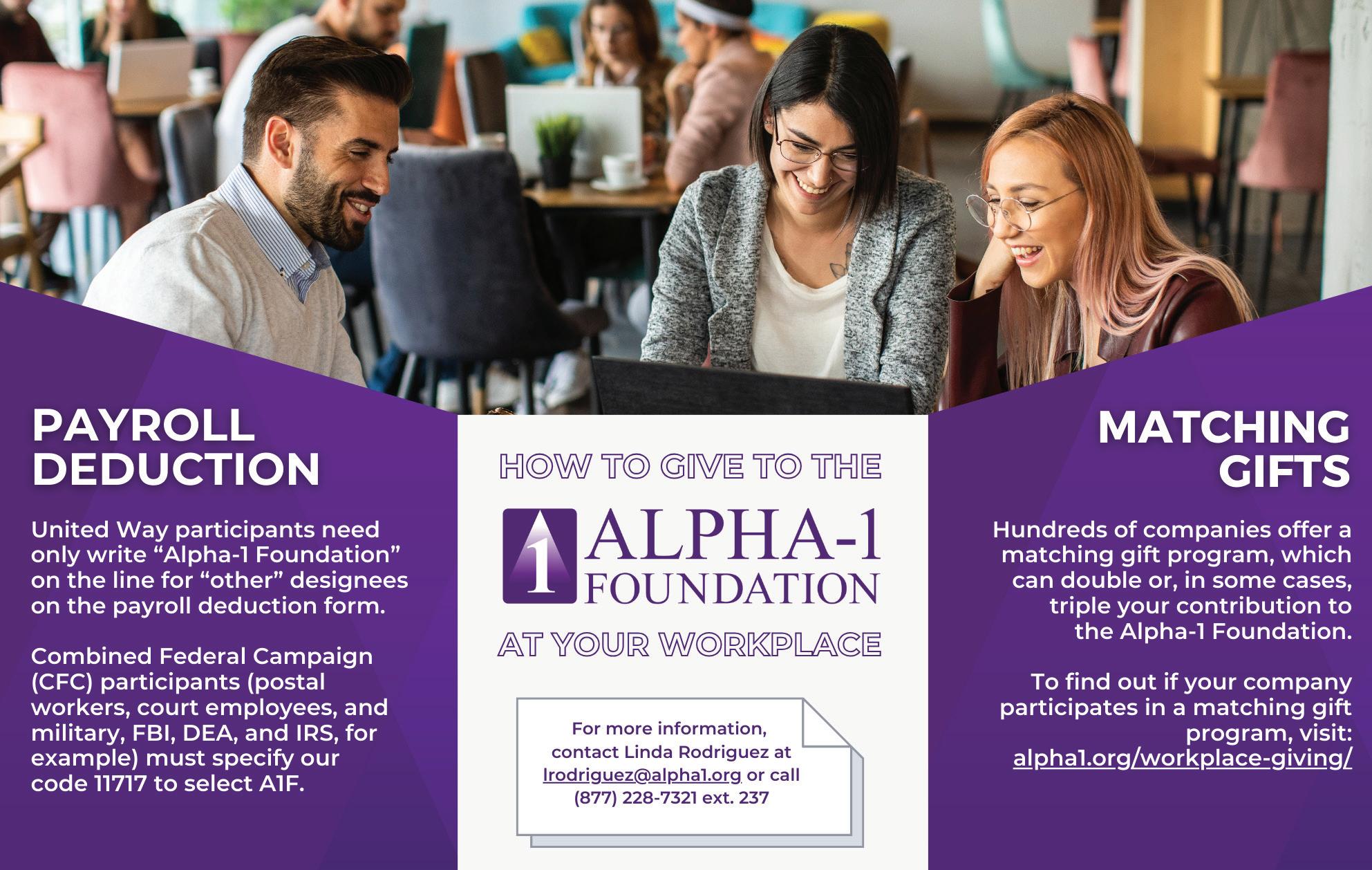 ALPHA-1-TO-ONE is published by the Alpha-1 Foundation with support from its advertisers. No part may be reproduced in any form by any means without prior written permission of the Alpha-1 Foundation. The contents are not intended to provide medical advice, which should be obtained directly from a physician. The Foundation is not responsible for the accuracy of information expressed in advertisements in this publication.