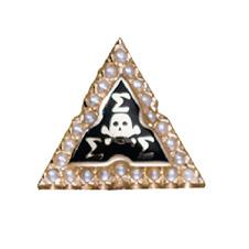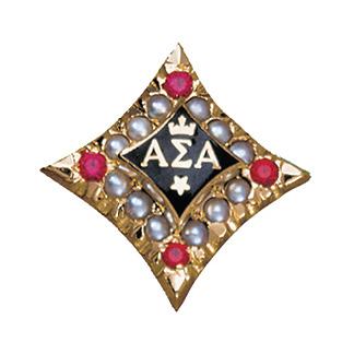 BADGE – a pin that is a distinctive emblem of membership in a sorority or fraternity; Alpha Chi Omega has a lyre badge
