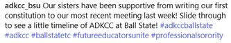 My collegiate club journey started in 2015 when Lynette Varner asked me if I wanted to be the first Alpha Delta Kappa Collegiate Club President for the chartering club at Ball State University. I served as president for two years and made so many lifelong connections and friendships from it. I graduated from Ball State in 2017 and became an official Alpha Delta Kappa sister in 2019. I am a member of the Indiana Tau chapter. I have served at the state level as the Indiana Vice President of Membership for three terms.