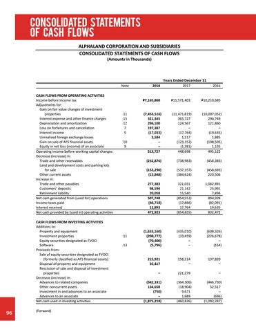 Note CASH FLOWS FROM OPERATING ACTIVITIES Income before income tax Adjustments for: Gain on fair value changes of investment properties Interest expense and other finance charges Depreciation and amortization Loss on forfeitures and cancellation Interest income Unrealized foreign exchange losses Gain on sale of AFS financial assets Equity in net loss (income) of an associate Operating income before working capital changes Decrease (increase) in: Trade and other receivables Land and development costs and parking lots for sale Other current assets Increase in: Trade and other payables Customers’ deposits Retirement liability Net cash generated from (used for) operations Income taxes paid Interest received Net cash provided by (used in) operating activities CASH FLOWS FROM INVESTING ACTIVITIES Additions to: Property and equipment Investment properties Equity securities designated as FVOCI Software Proceeds from: Sale of equity securities designated as FVOCI (formerly classified as AFS financial assets) Disposal of property and equipment Rescission of sale and disposal of investment properties Decrease (increase) in: Advances to related companies Other noncurrent assets Investment in and advances to an associate Advances to an associate Net cash used in investing activities