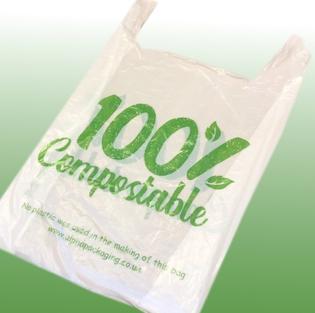 Degradable polythene vest carrier bags. Available with the text ‘100% degradable’ print on both sides available in two sizes