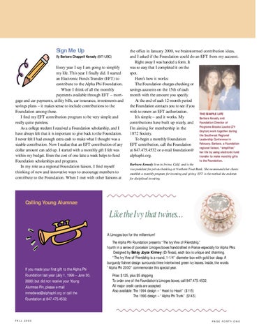 the office in January 2000, we brainstormed contribution ideas, and I asked if the Foundation could do an EFT from my account. Right away I was handed a form. It was so easy that I completed it on the spot. Here’s how it works: The Foundation charges checking or savings accounts on the 15th of each month with the amount you specify. At the end of each 12-month period the Foundation contacts you to see if you wish to renew an EFT authorization. THE SIMPLE LIFE It’s simple – and it works. My Barbara Kenady and contributions have built up nicely, and Foundation Director of Programs Brooke Loucks (ZYI’m aiming for membership in the Dayton) work together during 1872 Society. the Southwest Regional To begin a monthly Foundation Leadership Conference in February. Barbara, a Foundation EFT contribution, call the Foundation regional liaison, “simplifies” at 847.475.4532 or e-mail foundation@ her life by using electronic fund alphaphi.org. transfer to make monthly gifts to the Foundation.
