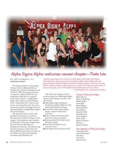 Alpha Sigma Alpha welcomes newest chapter—Theta Iota B Y A M Y H A M B R I C K , Leadership Consultant The Oregon Institute of Technology (Oregon Tech) in Klamath Falls was buzzing with excitement during the week of May 17, 2009. The group, previously recognized as Alpha Lambda Nu, was preparing to officially be recognized as the newest chapter of Alpha Sigma Alpha. The colony was named Oregon Tech’s “Club of the Year� only the week before, and during this week, the colony women prepared for the biggest honor of all, being installed as Alpha Sigma Alpha’s Theta Iota Chapter. The Sanctuary Degree Service and Installation Ceremony were held on Saturday, May 23, 2009 on Oregon Tech’s campus. The installation team consisted of National Vice President of Operations Nora Ten Broeck, , District 8 Facilitator Carol Jensen, , Membership Growth Coordinator Amber Shaverdi Huston, , Extension Project Coordinator Lori White Scott, and Leadership Consultant Amy Hambrick, .