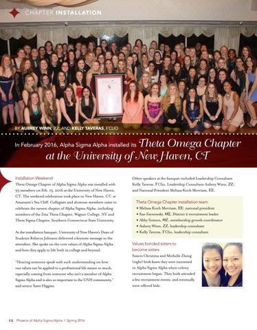 Installation Weekend Theta Omega Chapter of Alpha Sigma Alpha was installed with 93 members on Feb. 13, 2016 at the University of New Haven, CT. The weekend celebration took place in New Haven, CT, at Amarante’s Sea Cliff. Collegiate and alumnae members came to celebrate the newest chapter of Alpha Sigma Alpha, including members of the Zeta Theta Chapter, Wagner College, NY and Theta Sigma Chapter, Southern Connecticut State University. At the installation banquet, University of New Haven’s Dean of Students Rebecca Johnson delivered a keynote message to the attendees. She spoke on the core values of Alpha Sigma Alpha and how they apply to life both in college and beyond. “Hearing someone speak with such understanding on how our values can be applied to a professional life meant so much, especially coming from someone who isn’t a member of Alpha Sigma Alpha and is also so important to the UNH community,” said senior Sami Higgins.
