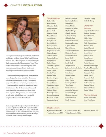 I nstallation gifts and donations sponsored by: National Vice President of Finance Kelly McGinnis Morello, EΚ, Suzanne Hebert, BZ, Susanne Withsosky Alfonso, NN, Donna Haines, GO, Meredith Anderson Cheryba, EΚ, Past National President Diane Yencic James, HH, District 2 Recruitment Leader Sue Zarnowski, ΘΣ, Chayna Wilson,EM, Greater Kansas City Alumnae Chapter.