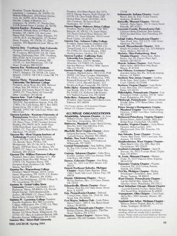 President, Ann-Marie Rispoli, Box 1574, 400 S. Orange Avenue, South Orange, NJ 07079; CA, Gina Trucillo Pintar, 520 Herrick Drive, Dover, NJ 07801 ; ACA, Alice Grodman, 26 Semon Road, Huntington, NY 11743 Gamma Sigma - Belmont Abbey College President, Marilyn Guthy, Box 532, BAC, Belmont, NC 28012; CA, Susan Hayes, 310 Peach Orchard Road, Belmont, NC 28012; CC, Karen Wheeler, 3503 Cornell Road, Fairfax, VA 22030 Gamma Tau- Lebanon Valley College President, Rania Gaitanis, Dickinson Hall, Apt. 20, LVC, Annville, PA 17003 ; CA, Teresa Eckard, 41 E. Columbia Road , Enola, PA 17025; CC, Donna Mandes, 1343 Harding Avenue, Hershey, PA 17033 Gamma Upsilon - California State University/Los Angeles President, Christine Sarlo, 2213 S. Meridian, Alhambra, CA 91803; CA, Annette Sanchez-Marrone, PO Box 1406, Agoura Hills, CA 91376 Gamma Omega - LaSalle University President, Maribeth !verso, SM C I S D, POB 20902, LSU West Complex, Philadelphia, PA 19 141 ; Co-CA, Taunia Halcrow, 7901 Rossevelt Boulevard #4 7, Philadelphia, PA 19152; Co-CA, Meredith Rambo, 112 Westbrook Road , Feasterville, PA 19053 Delta Alpha - Gannon University President, Usa Woods, 316-l/2 W. 9th Street, Erie, PA 16502; CA, Katherine Ullis Kramer, 422 Stafford Avenue, Erie, PA 16508 Delta Beta- Fairmont State College President, Julia Frisenda, 1441 Beech Lane, Fairmont, WV 26554 CA-Chapter Adviser; ACA-Assistant Chapter Adviser; CC-Chapter Consultant
