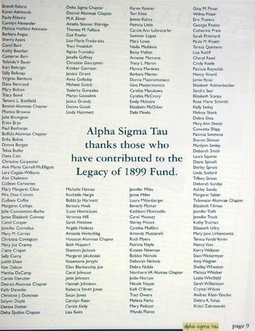 Alpha Sigma Tau thanks those who have contributed to the Legacy of 1899 Fund. Michelle Hannas Rochelle Hargis Bobbi Jo Hartnett Barbara Heeb Susan Henricksen Veronica Hill Sarah Hinshaw Angela Holeczy Amanda Holtschlag Houston Alumnae Chapter Beth Huppert Shannon Jackson Margaret Jakubczak Rosemarie Jerzylo Ellen Blankenship Joe Carol Johnson Janie Johnson Hannah Johnston Rebecca Smith Jones Susan Jones Carolyn Keen Carole Keily Lisa Keirn