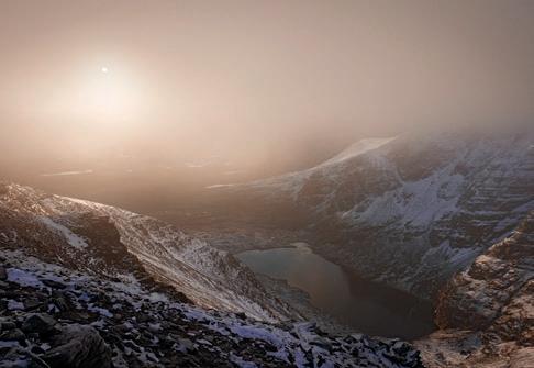 packing up, I should start to see some light by 6.30am perhaps. It was cold enough to shut my headtorch battery down and I was surprised to see, when my eyes adjusted, that the whole mountain was illuminated by the full moon. I walked up to the summit of Bidein a’Ghlas Thuill and the ridge stretched out glowing in front of me. It was