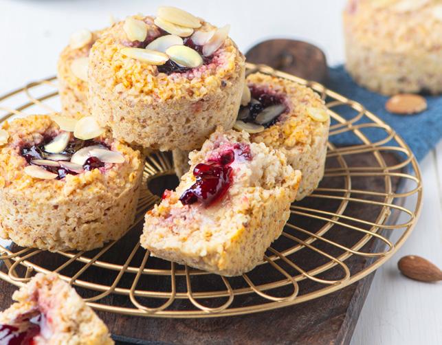 6. Carefully place a marzipan ball in each of muffins, press down gently. 7. Put a generous teaspoon of jam in each of the centres on top of the marzipan. 8. Cover with the rest of the oat mix; smooth with the back of a spoon. 9. Scatter the flaked almonds on top. 10. Bake 30-35 minutes until firm and the almonds on top are turning golden brown. 11. Wait until cooled to remove from the tray – the poffins will firm up. Method: