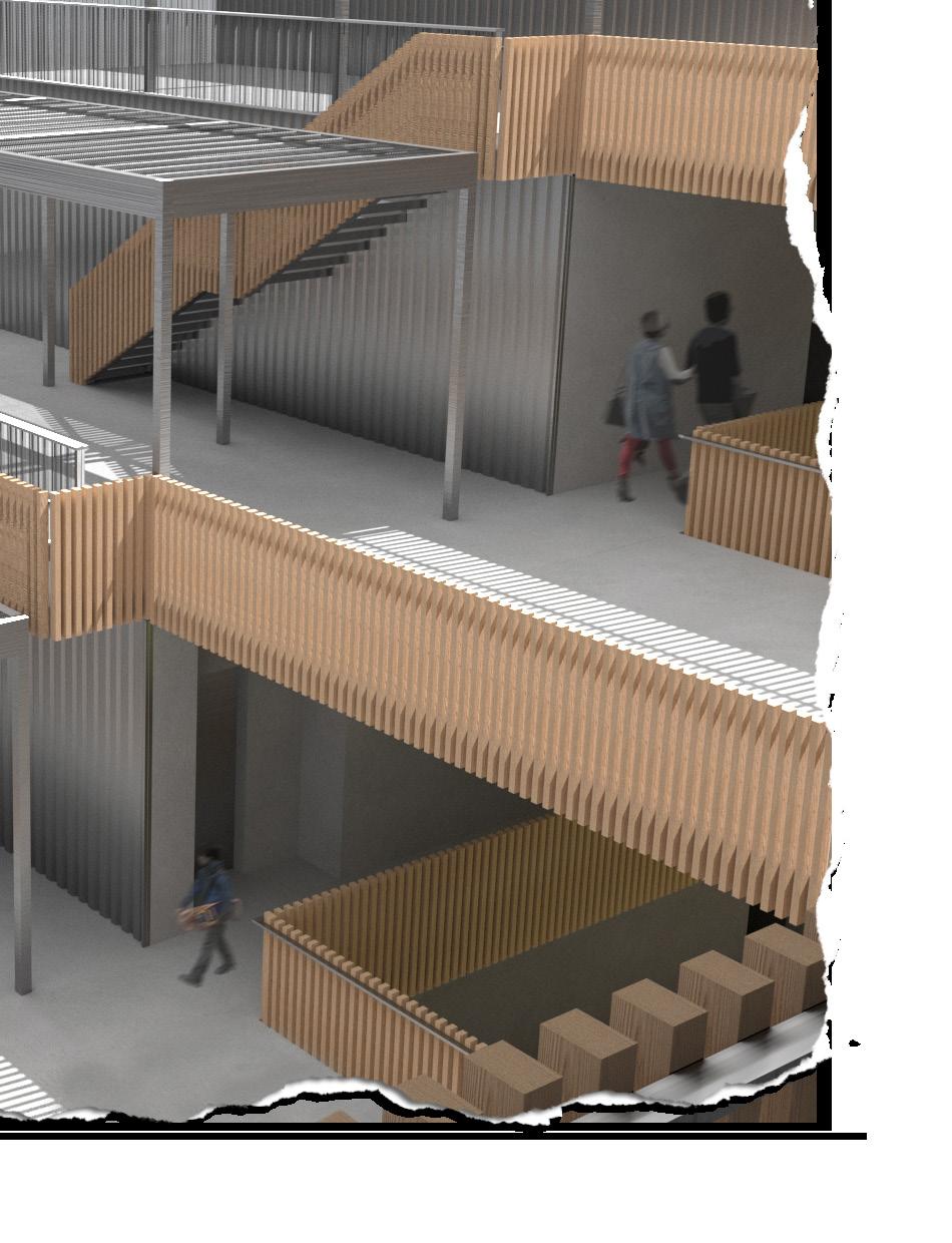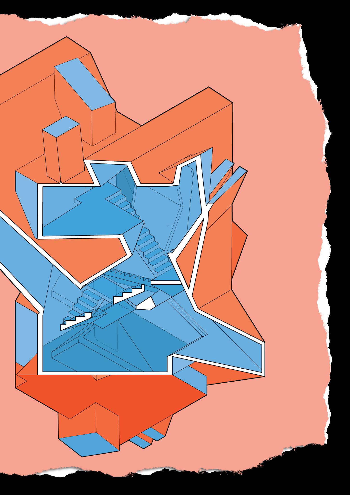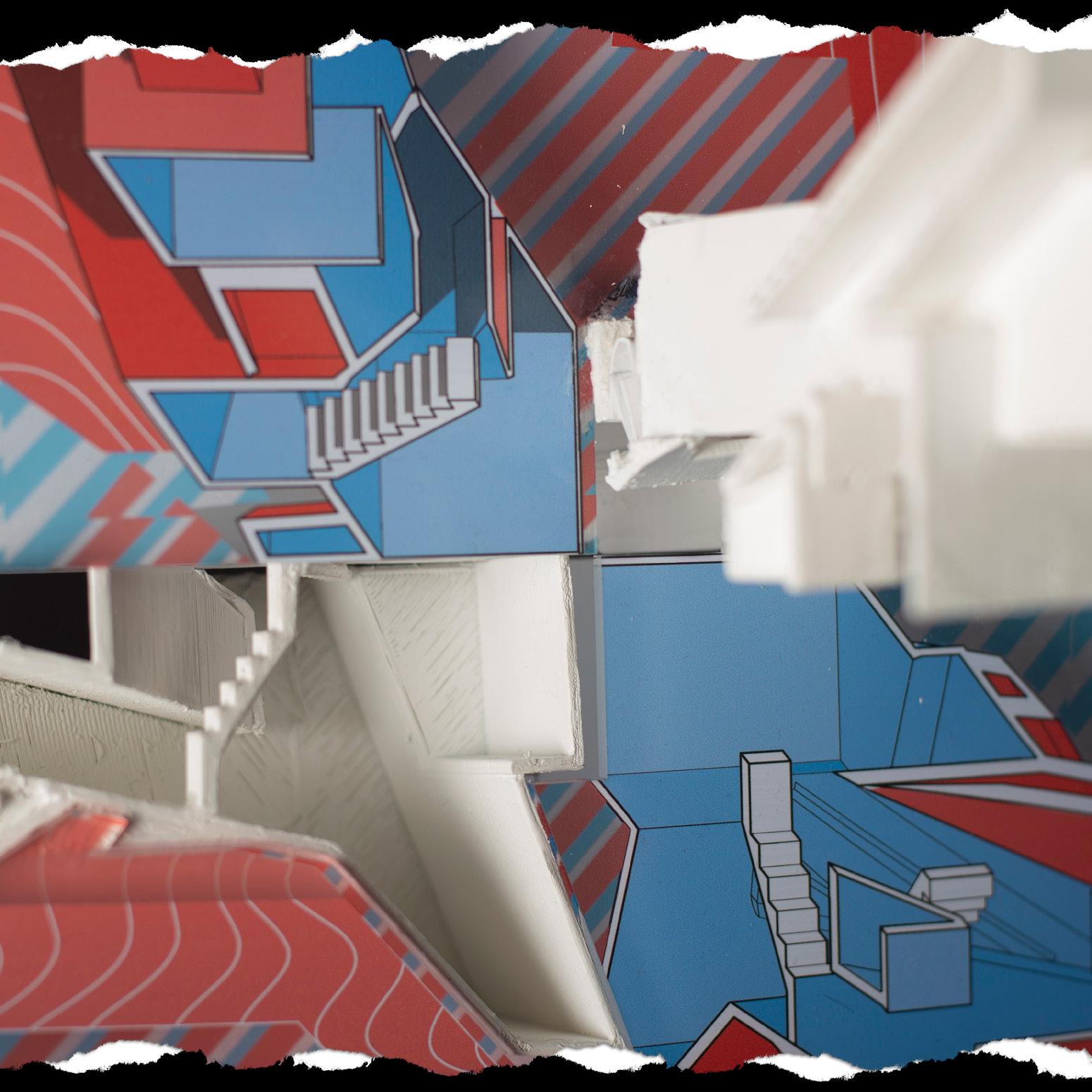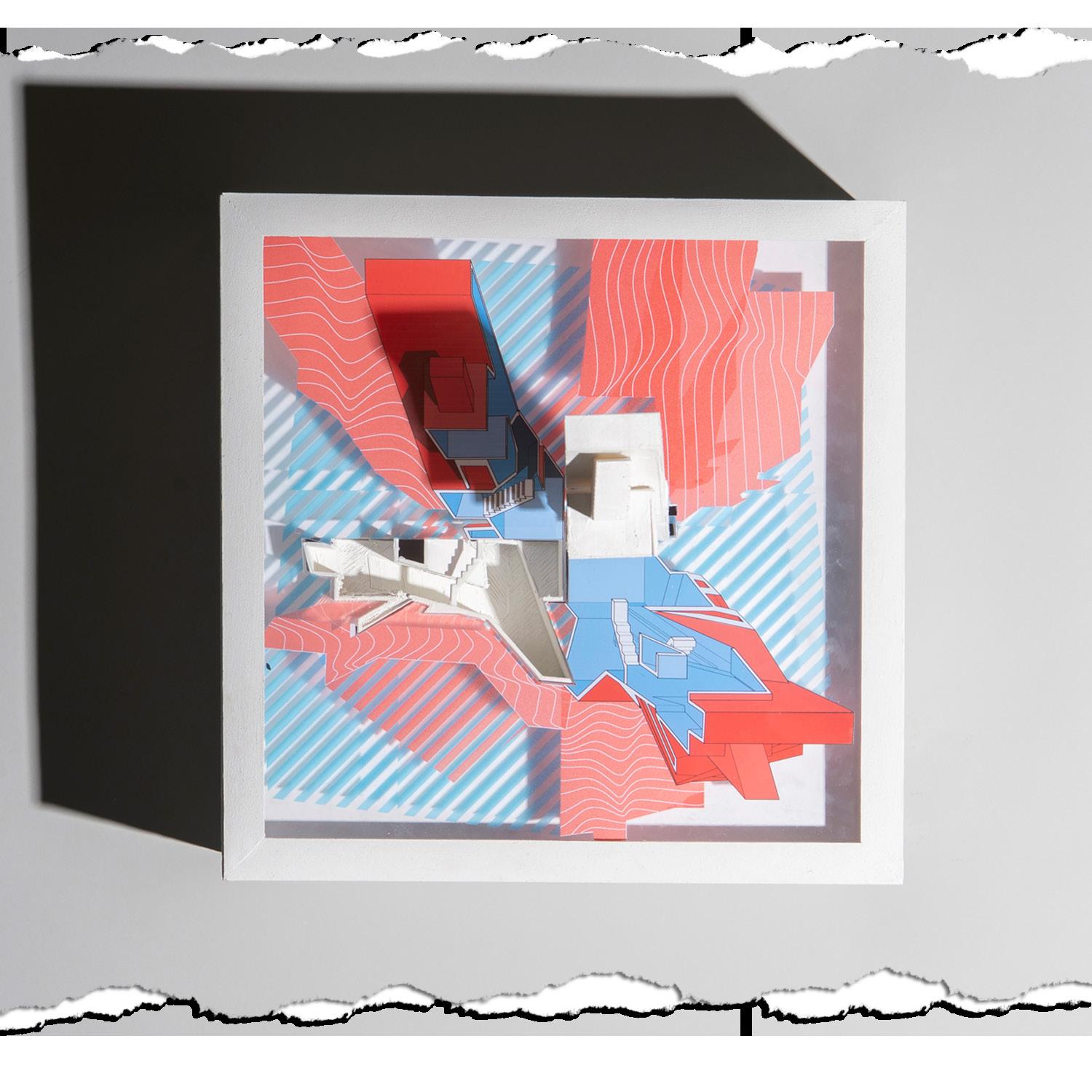 The resulting drawdel attempts to highlight the verticallity of spaces and the circulation between them within the object. This is acheived through the use of an axonometric section projection mixed with 3-D printed printed model pieces that coincide with the section cut.
