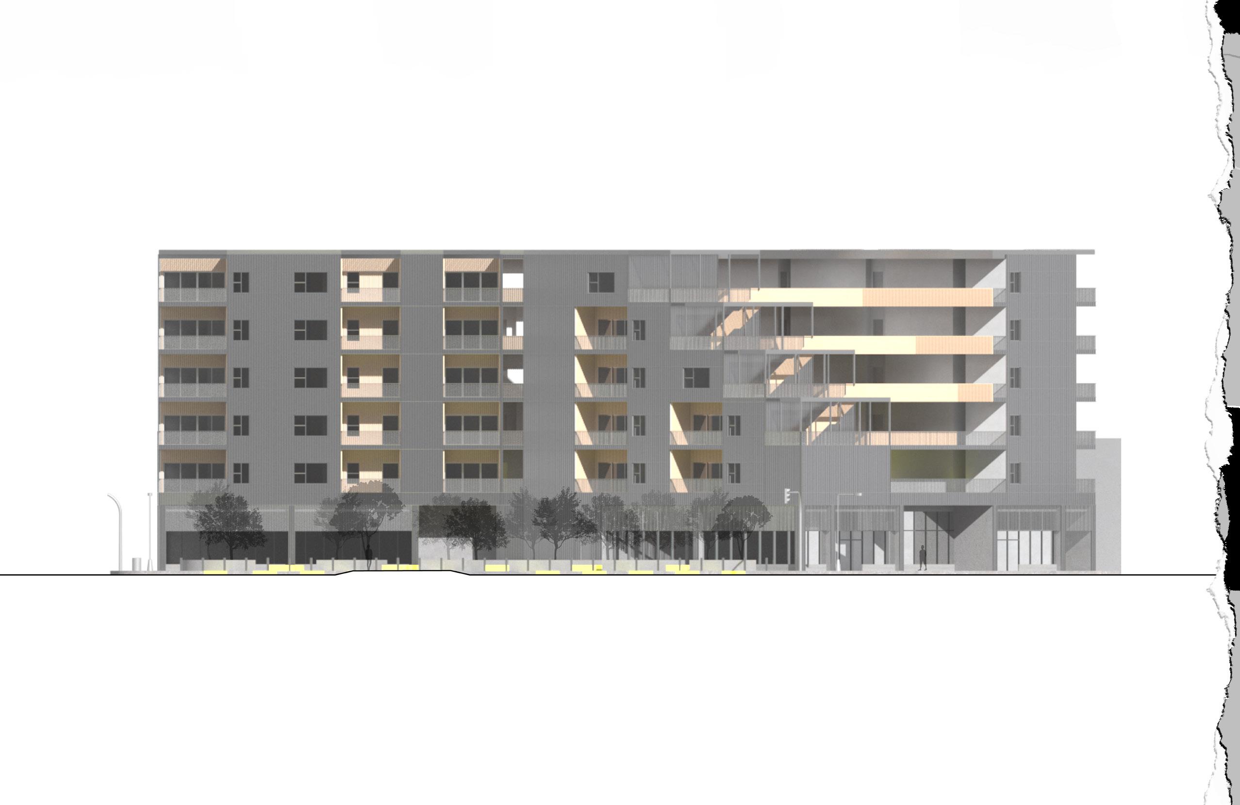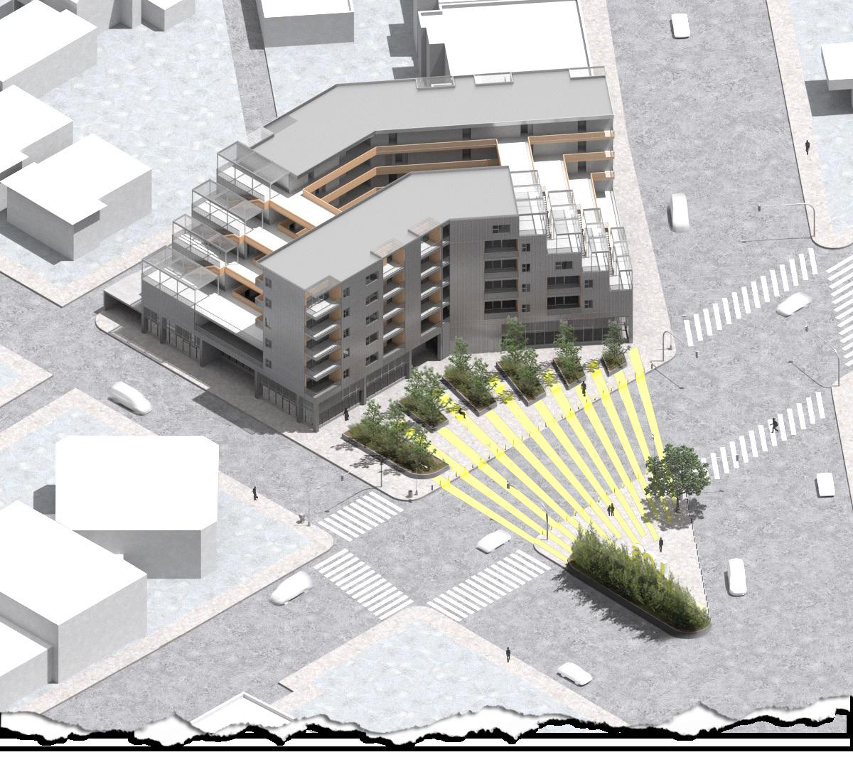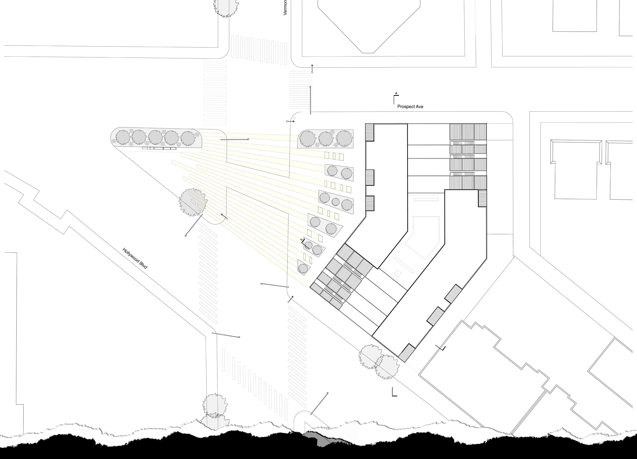 The market-rate, mixed-use housing proposal in the Los Feliz neighborhood of Los Angeles focuses on the use of a terraced structure and splaying mass pattern. These concepts respond to sunlight, wind patterns, views, and harbor an interactive tenant community connecting to the surrounding neighborhood.
