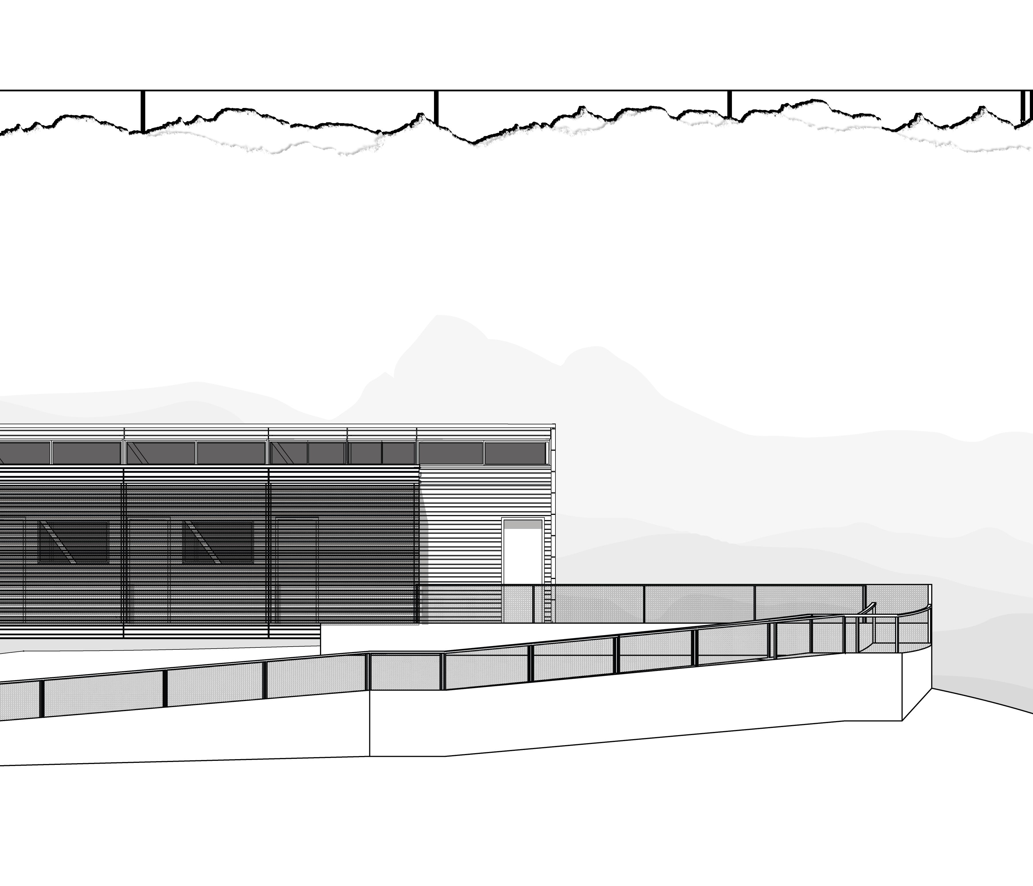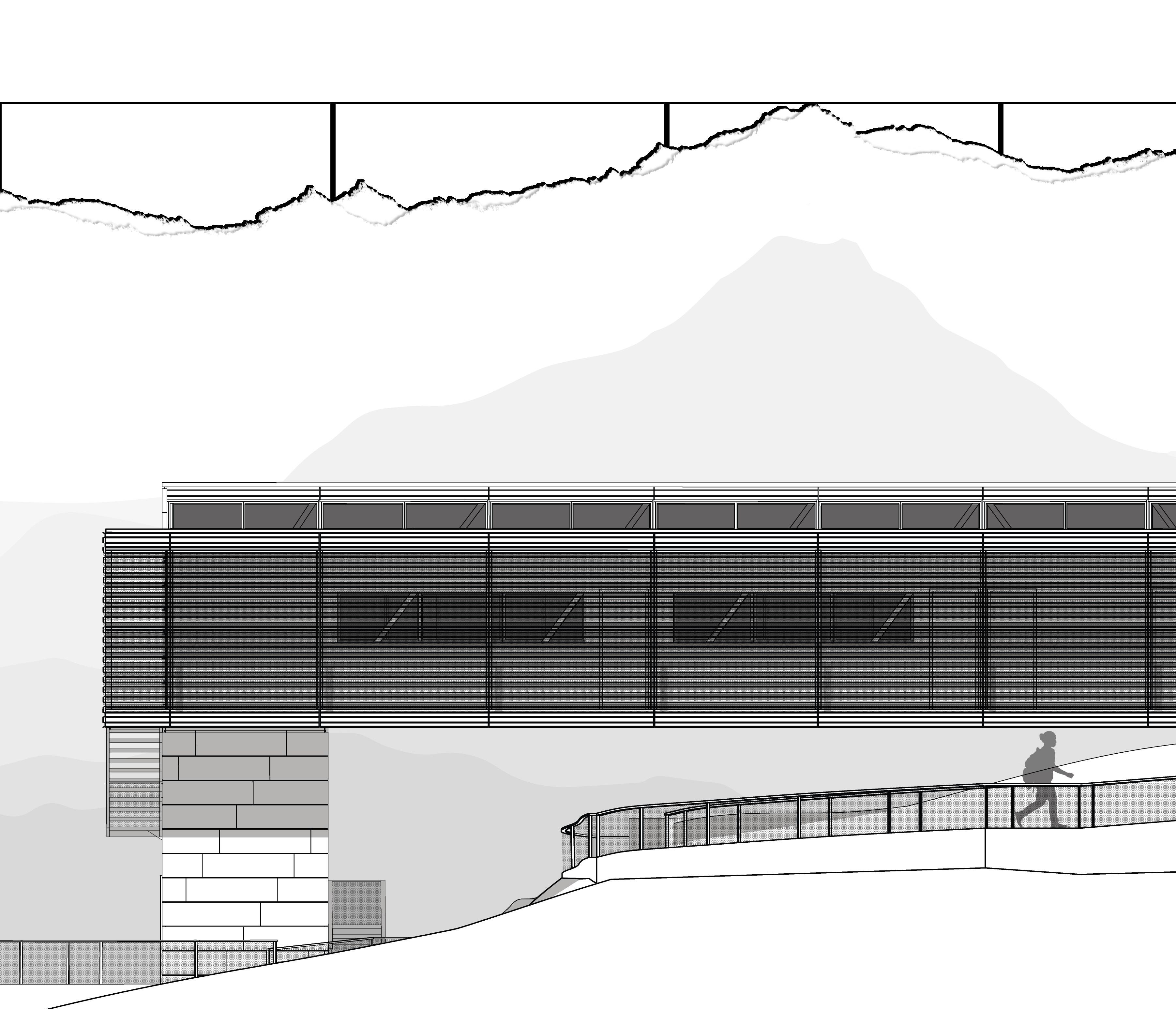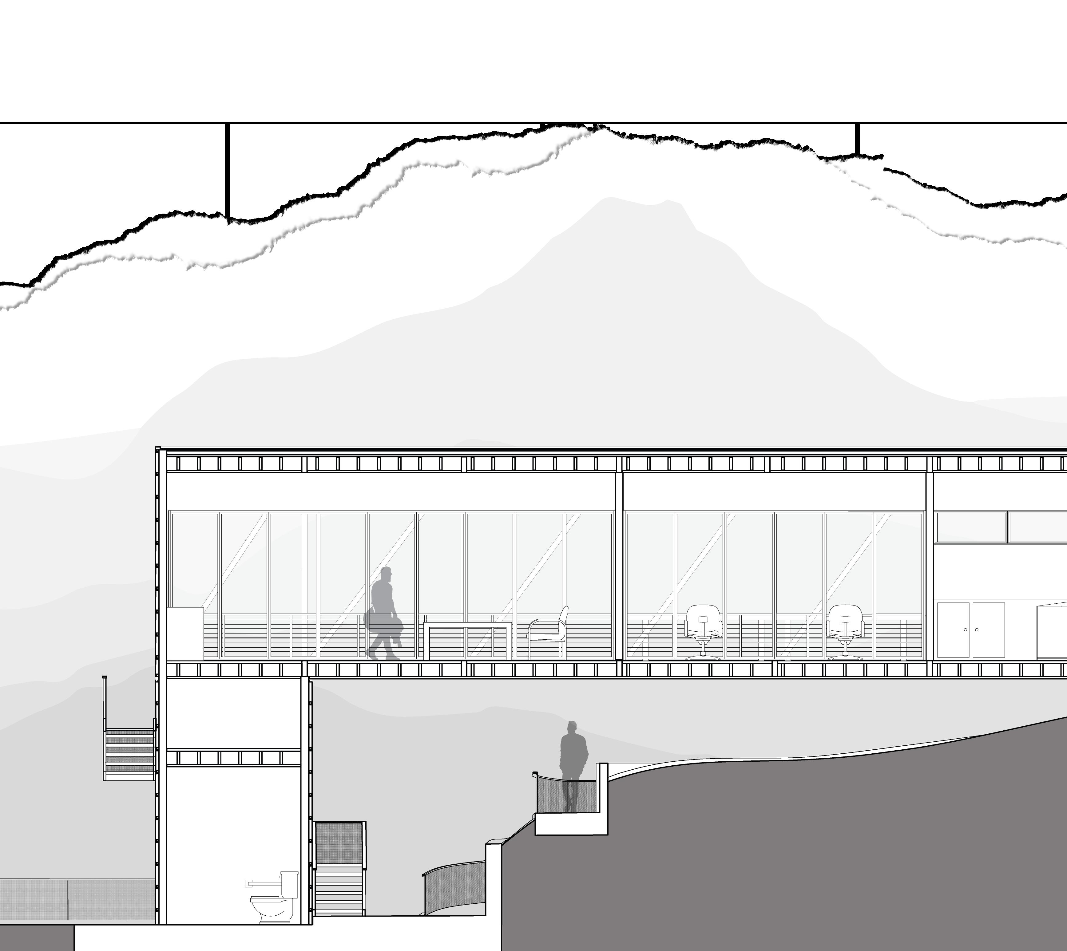The proposed design exentuates the idea of a building acting as a vehicle of circulation. A bridge structure connected to a tower form spans across the site and touches down on the upper and lower summit pads. A circulatory attachment is then added to the southern facade, which allows for movement across the site and in to the facility’s main program space which exists in the bridge. A sprawling ramp works in tandem with the building to provide for a continuous flow of circulation between the public summit pads and private scientist quarters.