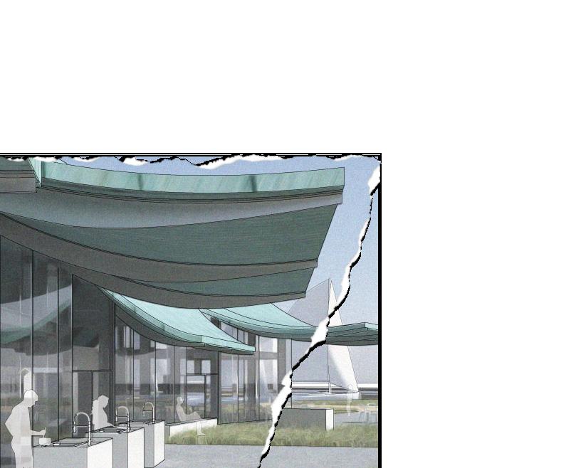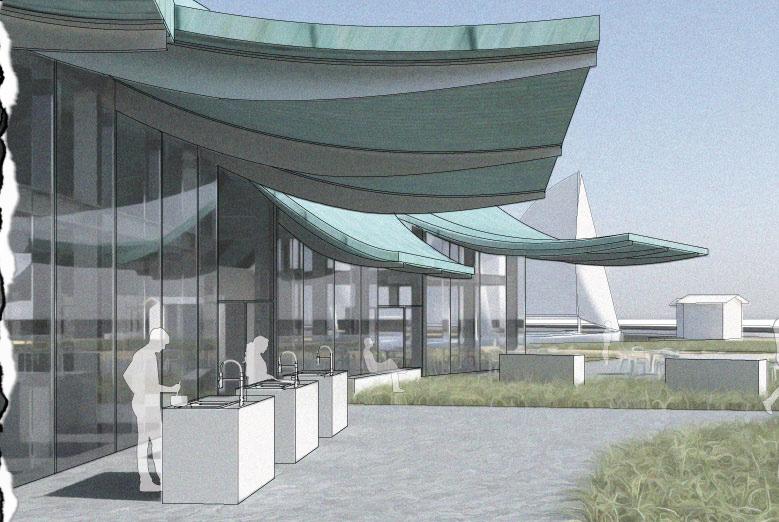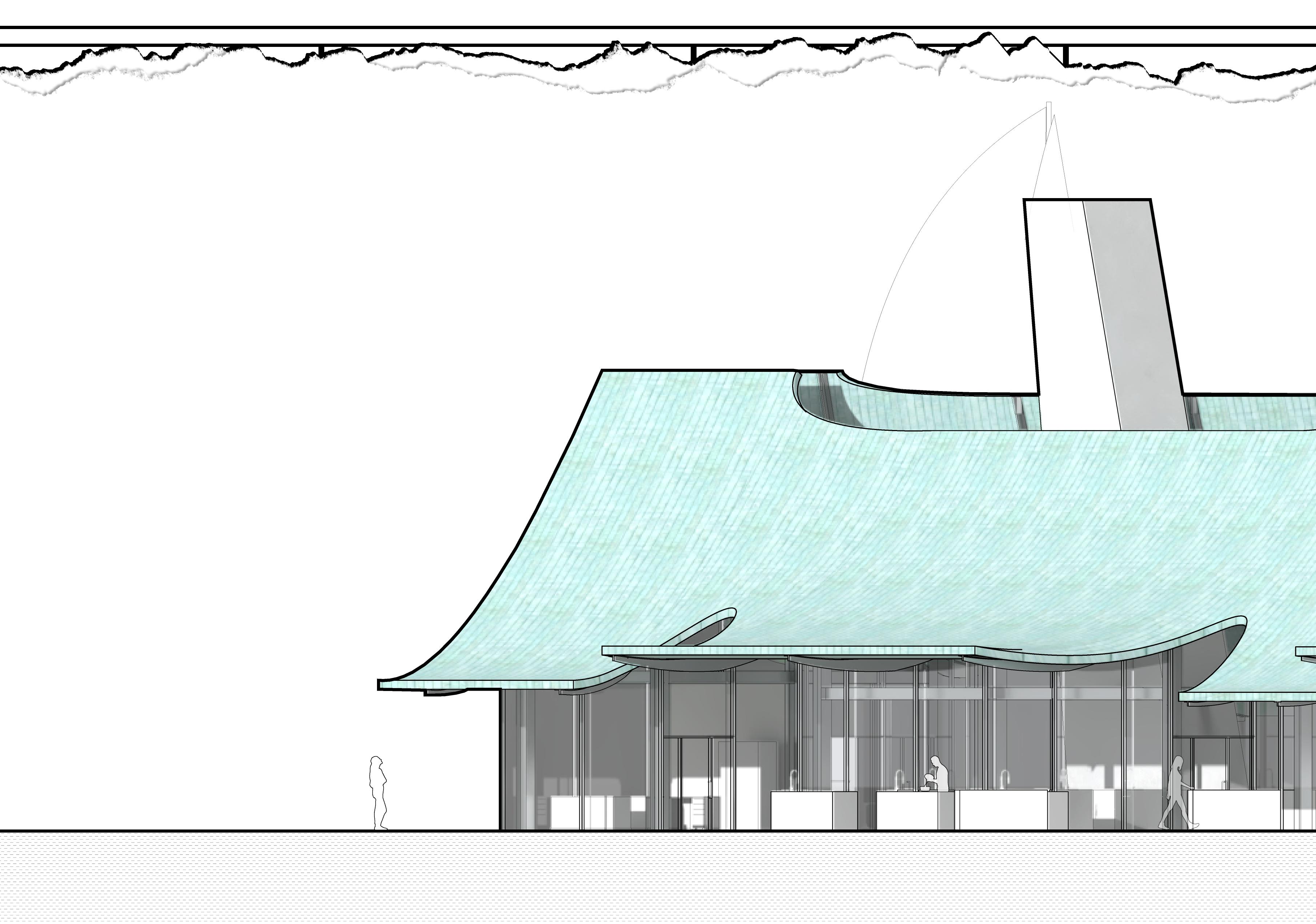 Located at the tip of Skovshoved Harbor -- a former fishing village 5 miles north of Copenhagen, Denmark -- the project aims at creating a beacon of Danish seafood culture that pays homage to the maritime history of the site. Underneath its sweeping roof form inspired by the flowing sails and masts scattered across the harbor landscape, a transparent flow of cooking, learning, and teaching is facilitated through a glass curtain wall construction supported by flying steel beams and gridded columns.
