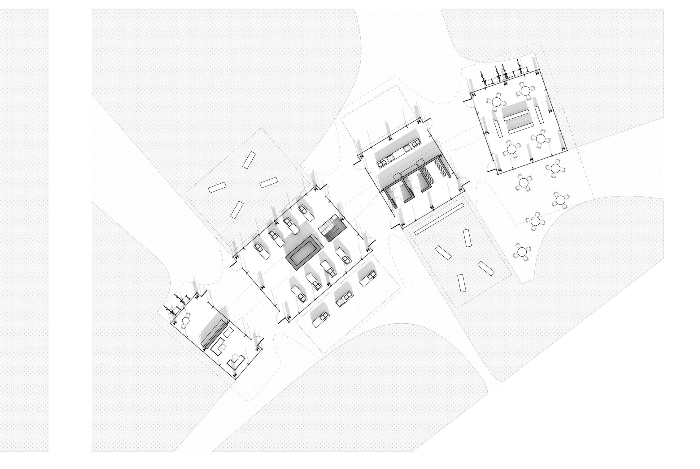 Visitors are invited in to the building by the pathways that sprawl out of it and across the site, facilitating circulation between the indoor teaching kitchens and outdoor learning spaces. The pathways change in size to accommodate space requirements for exterior cooking spaces and mimic the form of the undulating roof. The expansions and contractions of the roof on the exterior of the building help denote these exterior learning spaces, further engaging the public in both traditional and newer, more sustainable methods of seafood preparation emerging within the community and country at large.