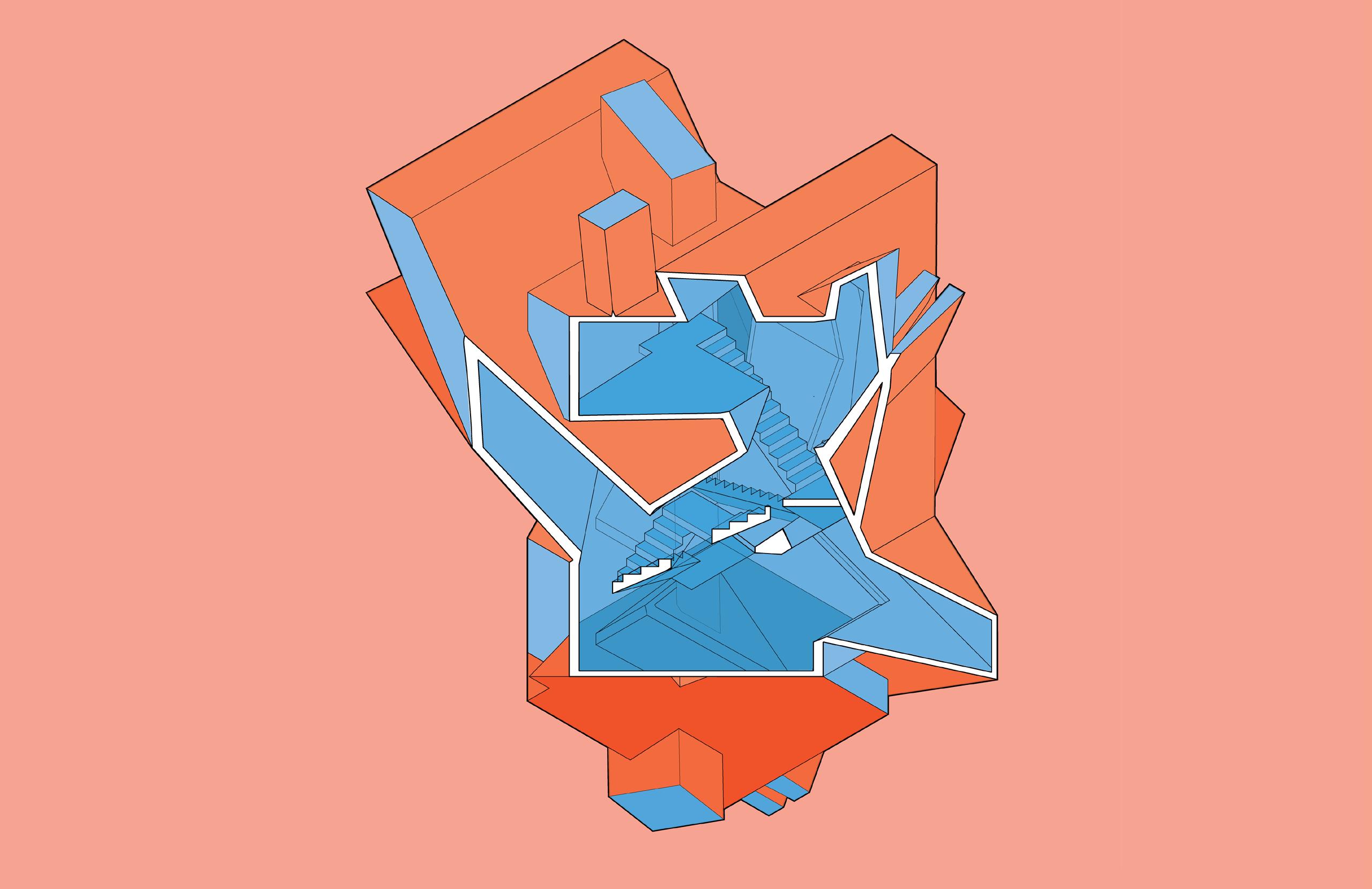 In this intermediate digital design studio, students explored and created a 3-dimensional structure from a 2-dimensional fields of letters from the Sans Serif font family. A heirarchy of spaces was created and a stair was inserted to connect these spaces within the object. Students then spliced the object through the creation of a ‘drawdel’: a hybrid drawing-model creation.
