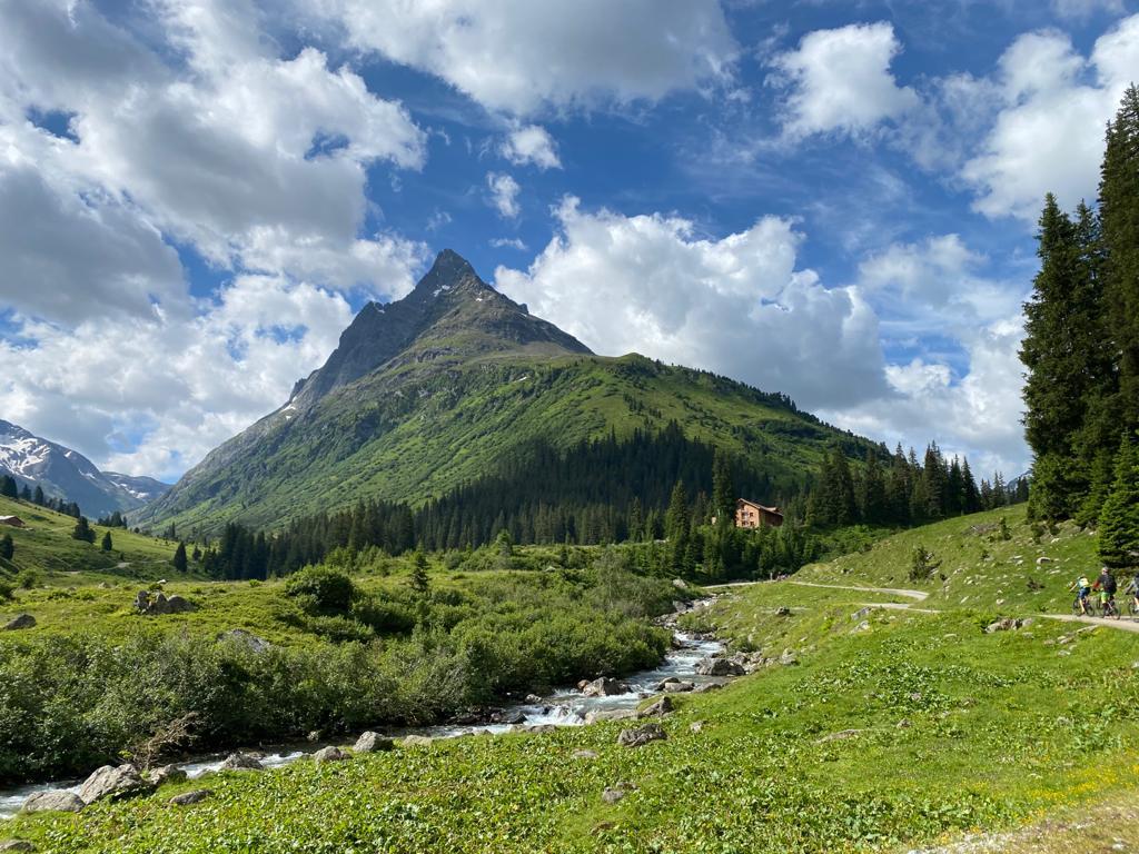 So könnte jeder Morgen beginnen. Ein herrlicher Schotterweg mit moderater Steigung führt uns zunächst ins Verwalltal hinein. Doch der Genuss hat eine Dreiviertel Stunde vor der Mittagspause ein jähes Ende. Gut 20 Minuten schieben stehen an. Eine steile, teils stufige Zwischenpassage muss von allen bewältigt werden. Am Hochplateau entschädigt uns jedoch gleich ein netter Singletrail mit schönstem Panorama. Nach der Mittagspause geht es zunächst auf breiten Schottenwegen teils steil bergab. Der Höhentrail zum Zeinissee ist gut fahrbar und erst zum Schluss sehr steil. Die letzten Kilometer nach Ischgl sind Genuß pur. Wir rollen teils auf Asphalt, teils auf herrlich weichen Waldwegen von oben direkt ins Hotel. Insgesamt ein perfekter Mountainbiketag mit allem, was sich Biker wünschen.