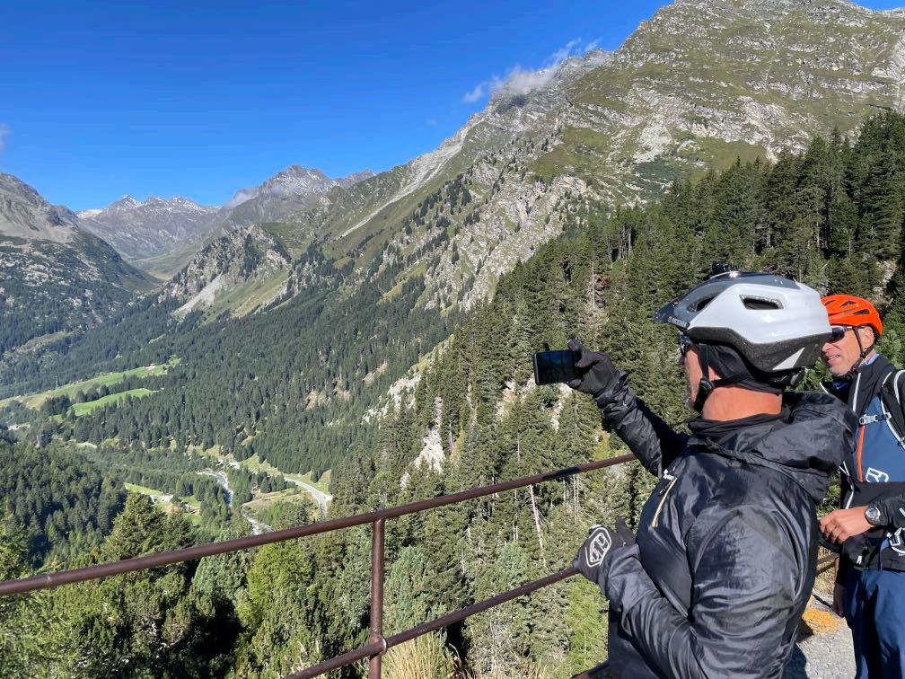 Auf neu gebauten Bikepark-Wegen geht es teils technisch und schweißtreibend gut 200 Höhenmeter weiter hoch bis zur Forcola Minor. Der knapp einstündige Anstieg kostet Kraft, lohnt aber jede Mühe. Der Ausblick ist gigantisch. Direkt vor uns ragt der Bernina Gletscher auf, tief unter uns liegen die zwei Gletscherseen. Der legendäre Bernina-Express gleicht von hier oben einer Spielzeug-Eisenbahn. Es folgt