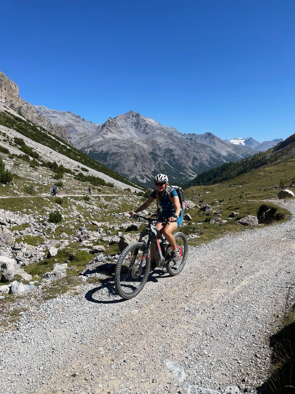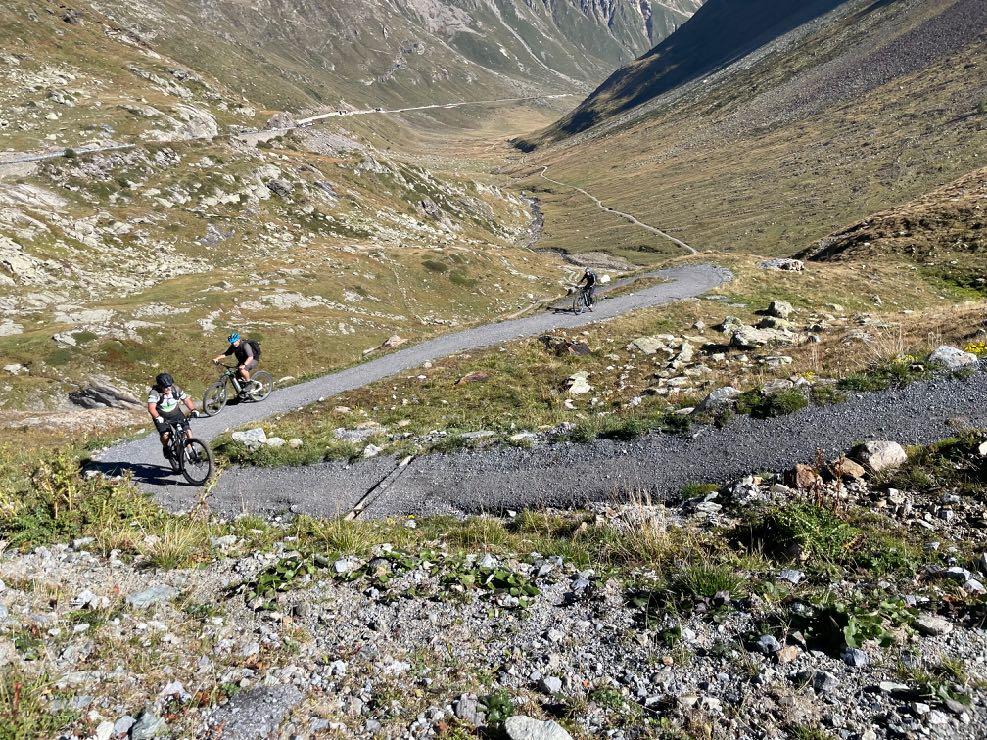 Die letzten Spitzkehren auf einem schmalen Pfad sind nur erste Herausforderung für unsere Kletterer in der Gruppe. Fahrbar, aber ganz schön steil. Danach geht es technisch und anstrengend weiter. Der Anstieg zum Val Minor wurde zwar für Biker gebaut, fordert aber alle Kräfte. Selbst Spitzkehren gilt es bergauf zu meistern. Von hier oben beginnt eine Traumabfahrt auf einem Naturtrail hinunter zum Bernina Pass. Legendär ist auch der Trail weiter bis nach St. Moritz hinab. Wir rollen auf Schotter, Waldwegen und teils wurzeligen Singletracks. Auch die letzten Meter entlang der beiden Seen sind herrlichste Mountainbike-Wege. Ein rundum schöner Tag.