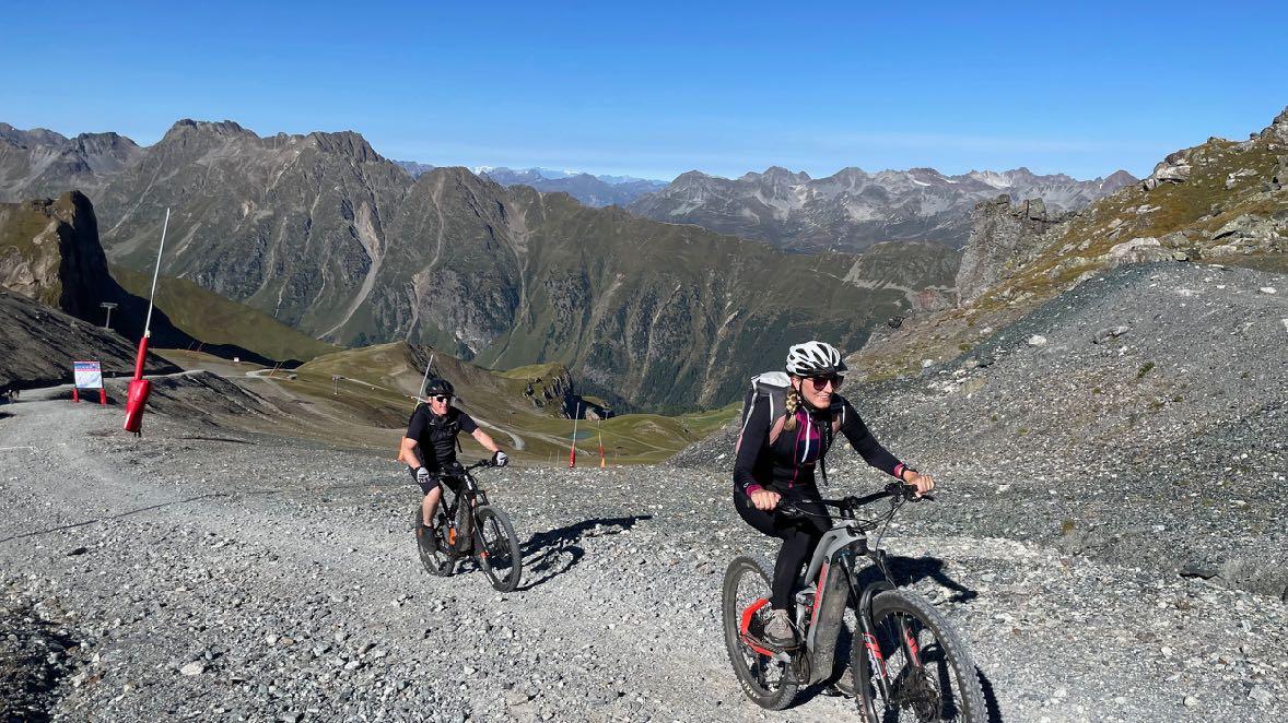 Der Alpenhauptkamm wird heute bezwungen. Wahlweise hilft uns die Seilbahn mehr oder weniger dabei. Mit der Gondel geht es zunächst für alle bergauf bis zur 2300 Meter hoch gelegenen Idalp. Dort ist eine Entscheidung fällig. Entweder gut 400 steile Höhenmeter bergauf durch schönste Bergkulisse, oder ein weiterer Sessellifttransfer bis zum 2700 Meter hoch gelegenen Idjoch. Die Fels- und Geröllandschaft um uns herum ist mehr als beeindruckend, der Blick vom Alpenhauptkamm gigantisch. So schön können die Berge sein. Wie im Rausch vernichten wir dann Höhenmeter um Höhenmeter und passieren dabei gleich mehrfach die Landesgrenzen. Ischgl und das schweizerische Samnaun haben sich seit Jahren den Mountainbikern verschrieben und so gibt es hier eine ganze Reihe von gebauten Trails. Wir nehmen die Trailpassage hinunter zur Alp Trida. meist auch ein willkommener CappuccinoStopp. Dann geht es weiter bergab bis ins Schmugglerdorf Samnaun. Nach