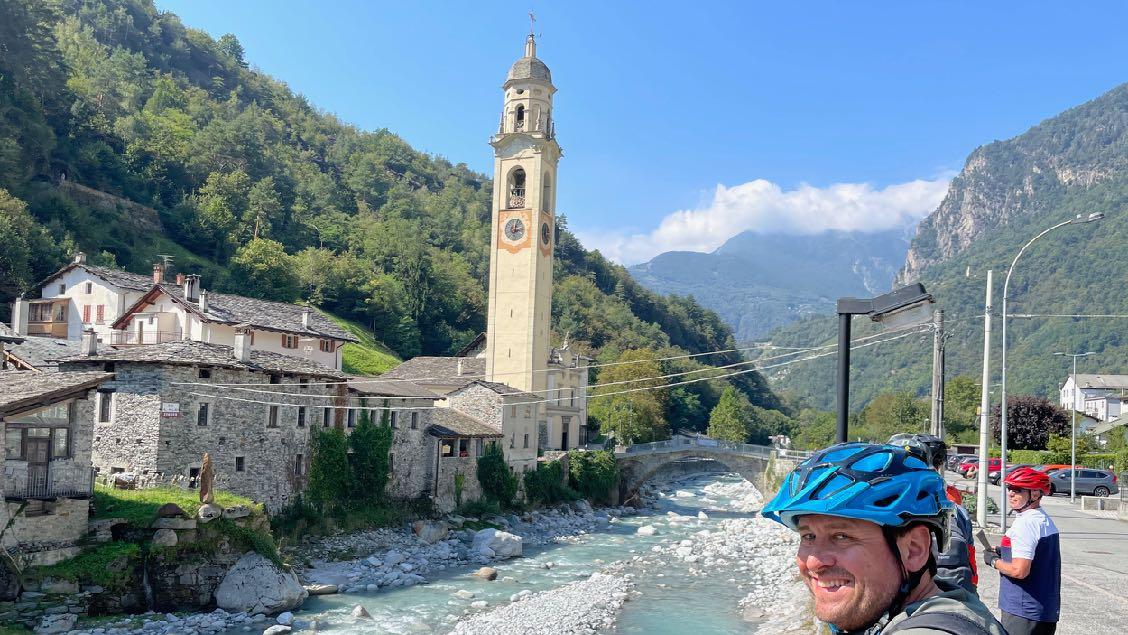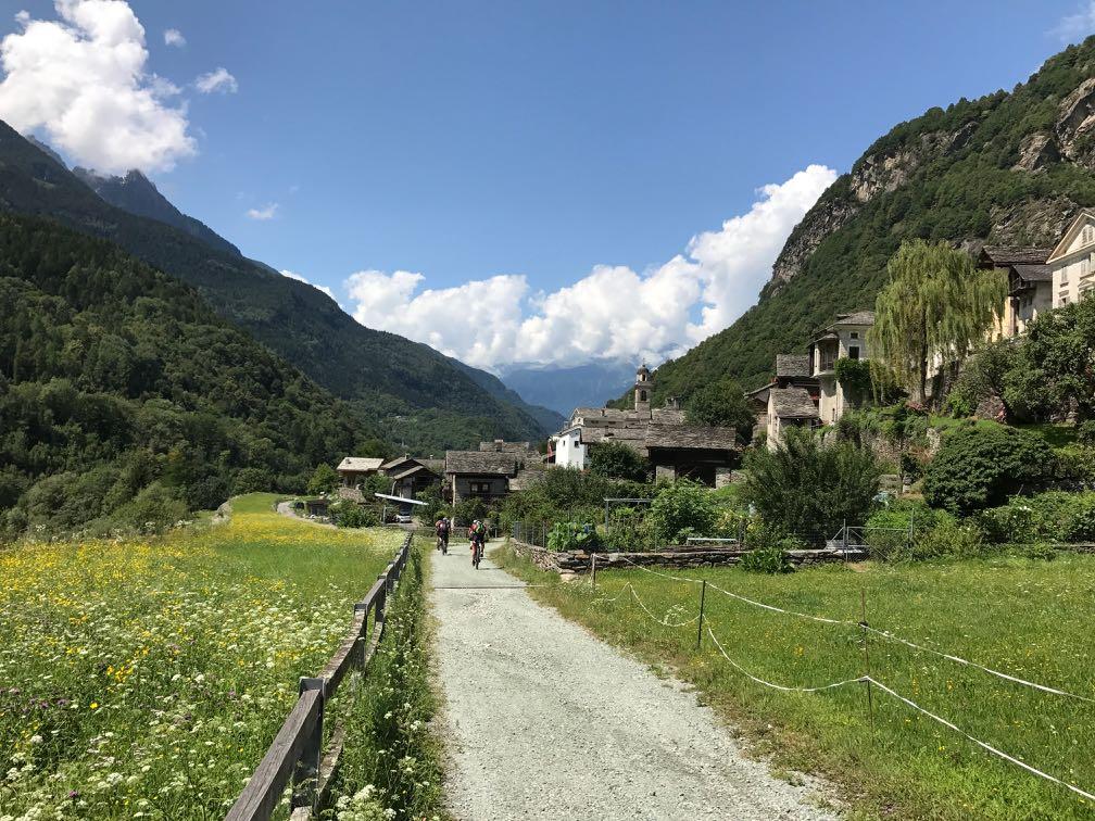 Wieder wachen wir vor traumhafter Bergkulisse auf. So sollte jeder Morgen beginnen. Noch unberührt ist die spiegelnde Wasserfläche des Silser Sees, wenn wir mit unseren Rädern starten. Hoch über uns stürzt der junge Inn mit einem imposanten Wasserfall herab. Wir begreifen warum der Alpentourismus von hier vor mehr als 200 Jahren seinen Anfang nahm und warum Filmemacher immer wieder hierher gezogen werden. Wir erklimmen den Maloja-Pass beinahe gänzlich ohne Höhenmeter. Von nun an geht's bergab. Auf einem Mix aus Asphaltstrecken und uralten, versteckten Karrenpfaden arbeiten wir uns hinab ins Bergell. Die Ortschaften haben plötzlich einen ganz anderen Charakter, auch die Berge sind