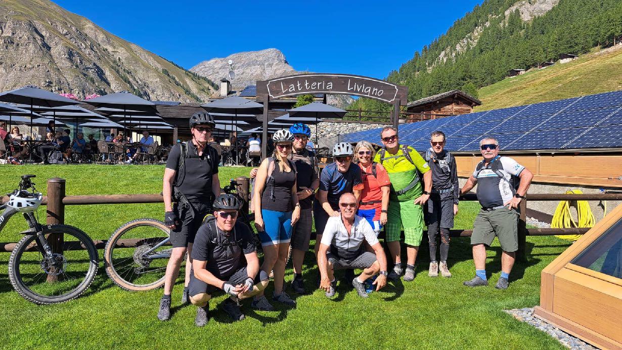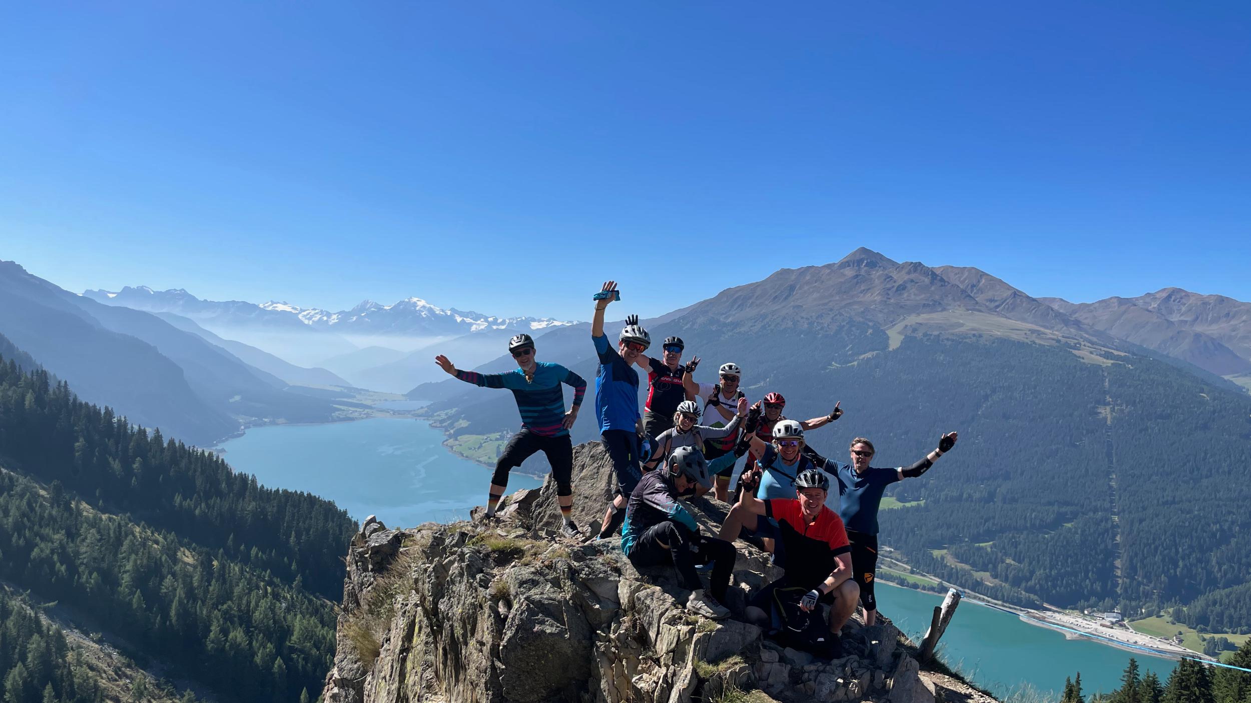 dem Lago di Cancano. Wieder taucht der Gletscher des Ortlers vor uns auf. Der Tisch ist für uns bereits in traumhafter Kulisse gedeckt. Selten haben Hüttennudeln besser geschmeckt. Wir umrunden den See und schrauben uns am Nachmittag nochmal eine Stufe höher. Spitzkehre um Spitzkehre rückt das nächste Highlight - die Alpisella - näher. Die alte Militärstrasse, ein sogenannter Dynamite-Trail, macht das Erlebnis nicht zu anstrengend. Es folgt ein knackiger Downhill auf steilstem Schotterweg und wir genießen den günstigsten Cappuccino der Tour, direkt am Bergsee bei Livigno in einer Hütte. Von hier rollen wir in Livigno ein. Ist noch Zeit für ein Eis in der Bergmolkerei, Shopping im Zollparadies oder doch lieber Entspannen im Wellness-Bereich? Wir übernachten im schicken SPA Hotel Lac Salin oder der dazugehörigen Montivas Lodge.So haben wir uns Urlaub vorgestellt.