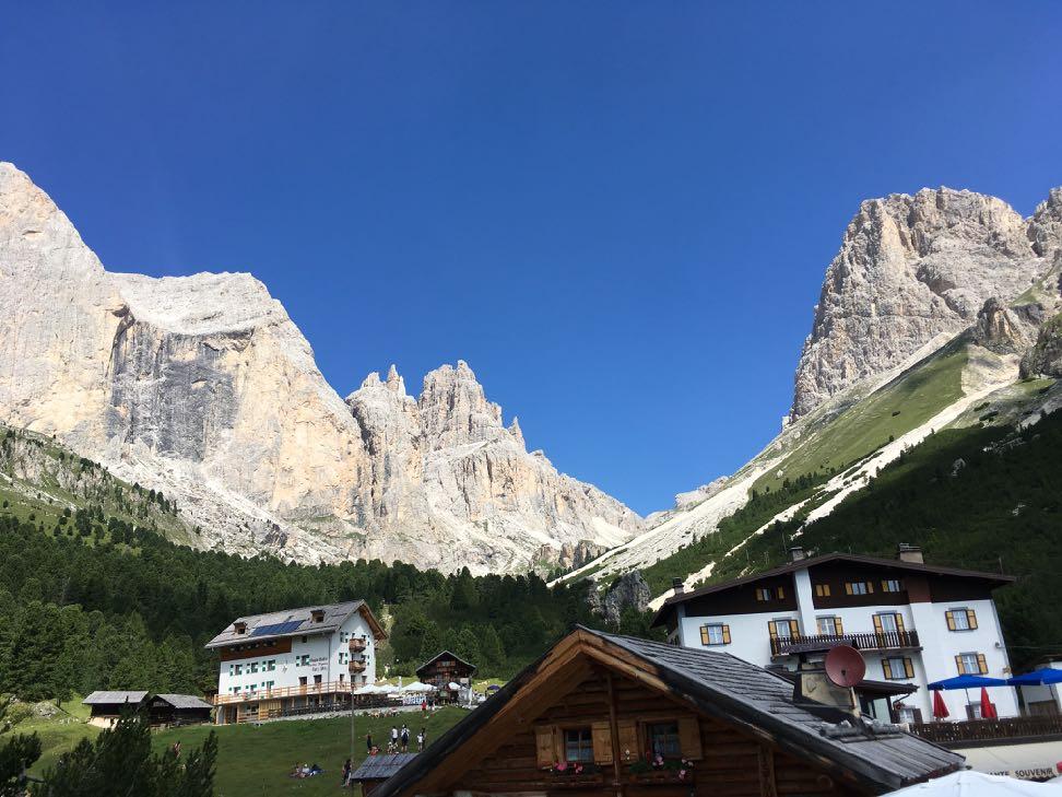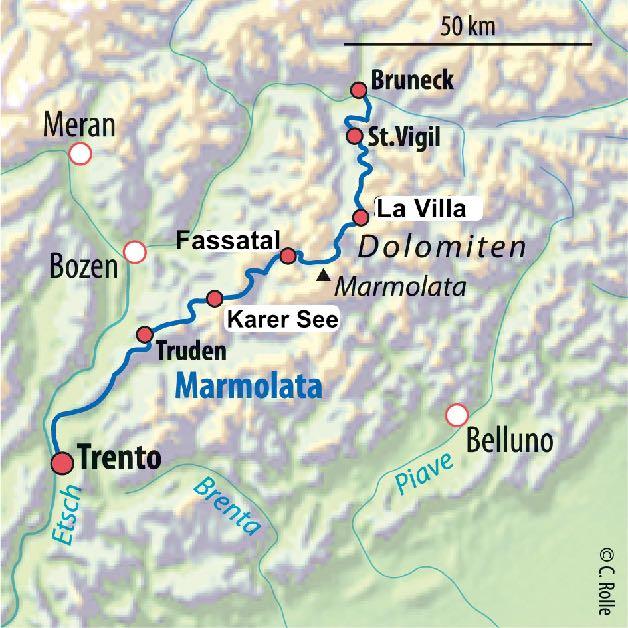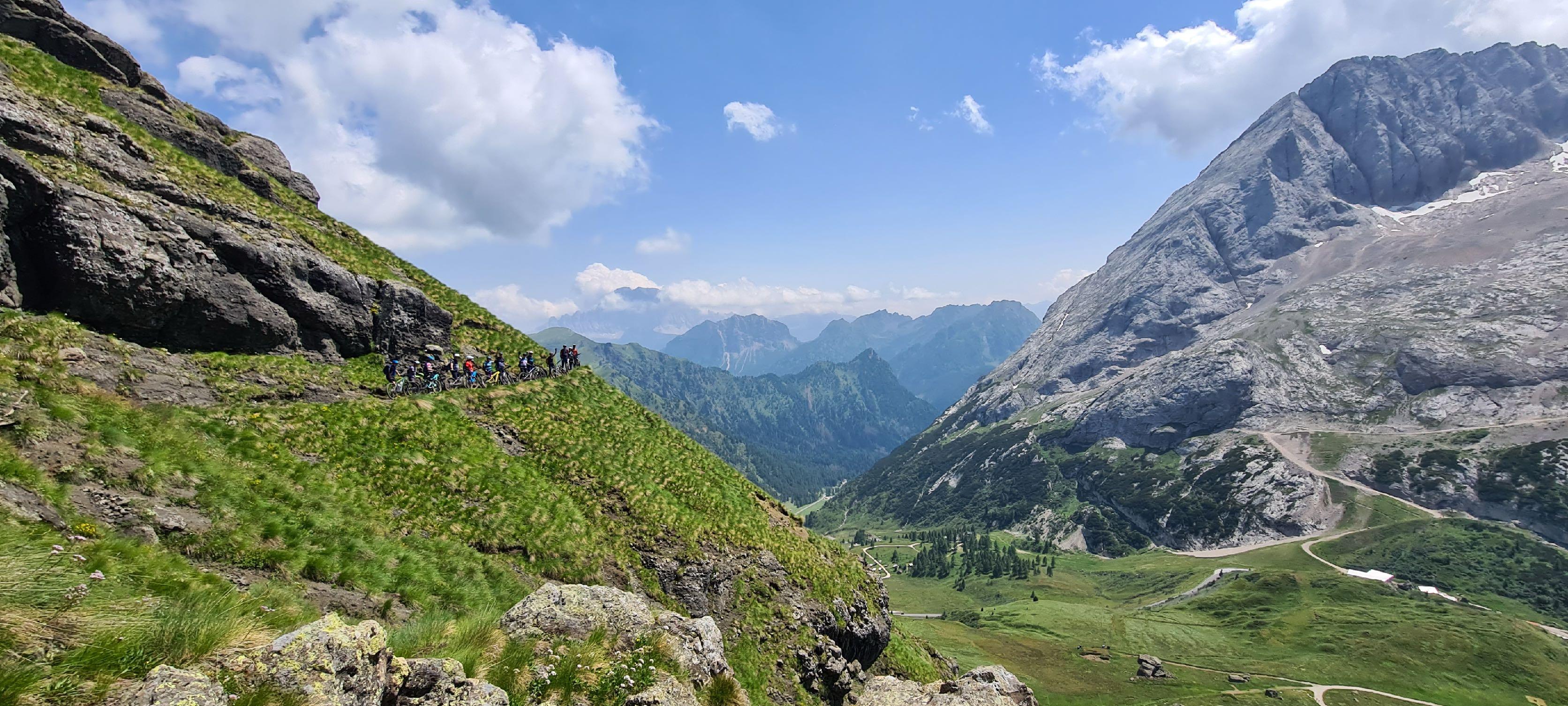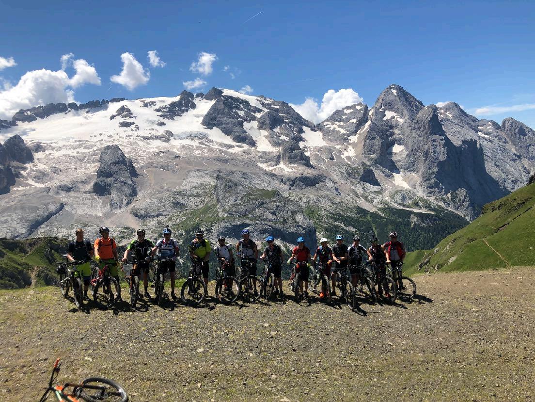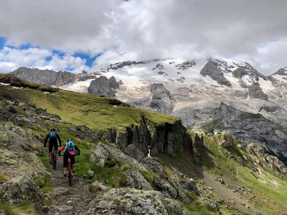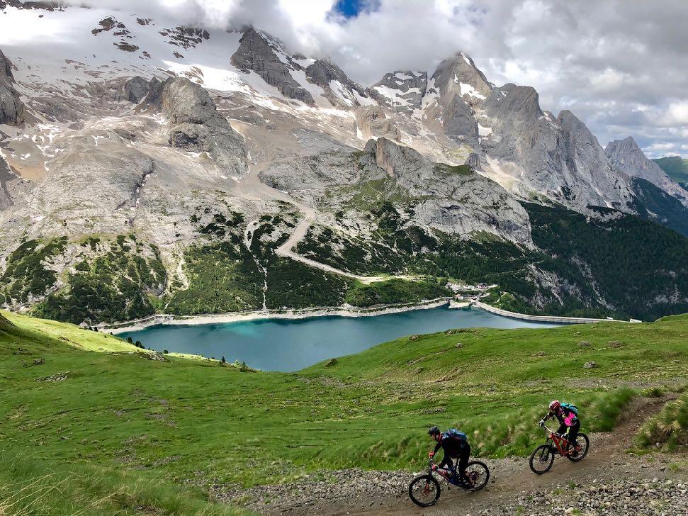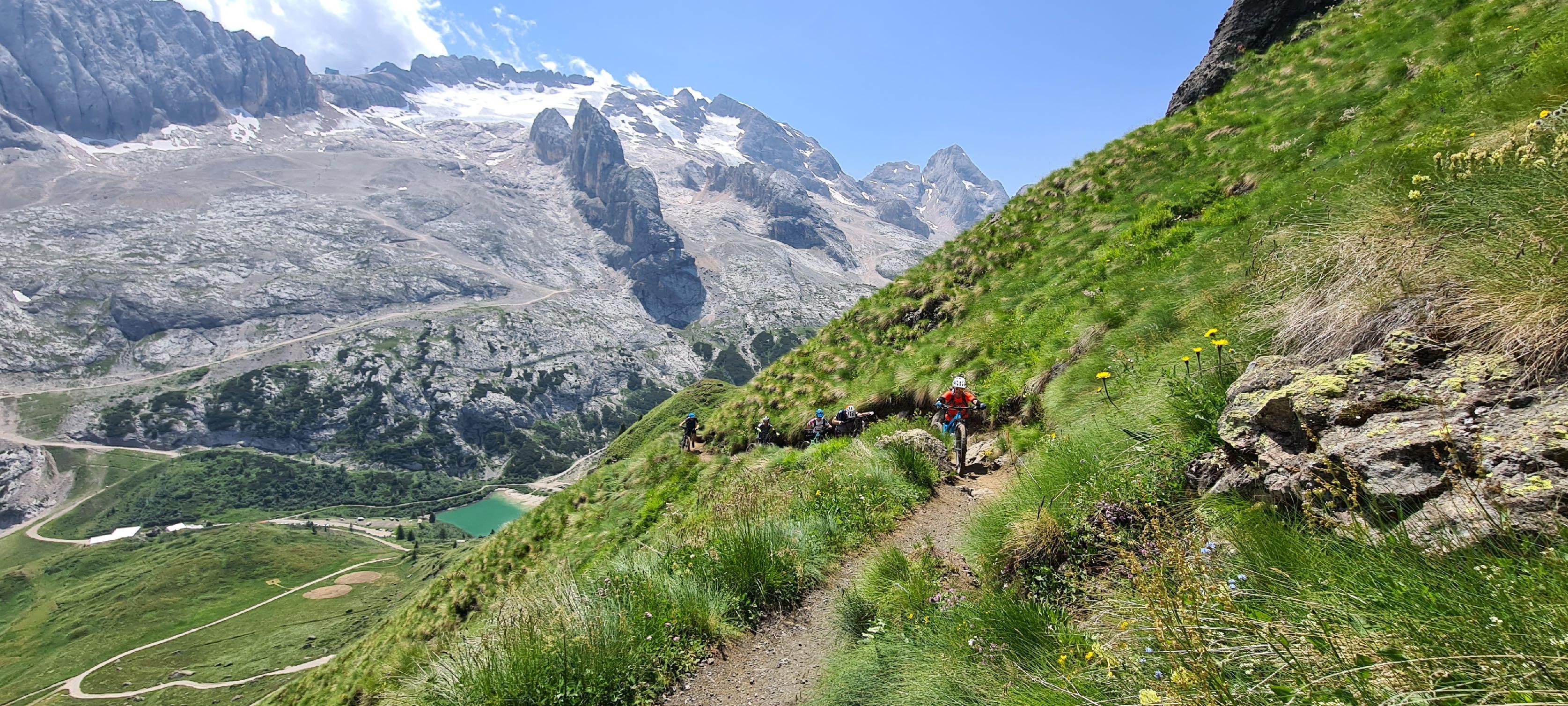 2500 Meter hoch gelegene Porta Vescovo. Jetzt stehen wir der Marmolata direkt gegenüber. Der Gletscher scheint zum Greifen nah. Auf fast einer Höhenlinie zieht sich hier der legendäre Weg bis hinüber zum Rifugia Padon, unserer Mittagspause. Eine Passage Schieben ist bei diesem Ausblick keine Strafe. Der Ausblick ist einfach zu gewaltig. Die Mittagspause wird somit zum Hochgenuss. Ab der Hütte wird der Weg nochmals breiter und wir sind schnell am Fedaia Stausee. Nun geht es auf einem teilweise sehr anspruchsvollen Trail Richtung Penia. Angekommen im Fassatal blicken wir hoch hinauf zum Sella-Massiv. Ein Tag voller Höhepunkte.