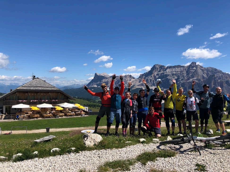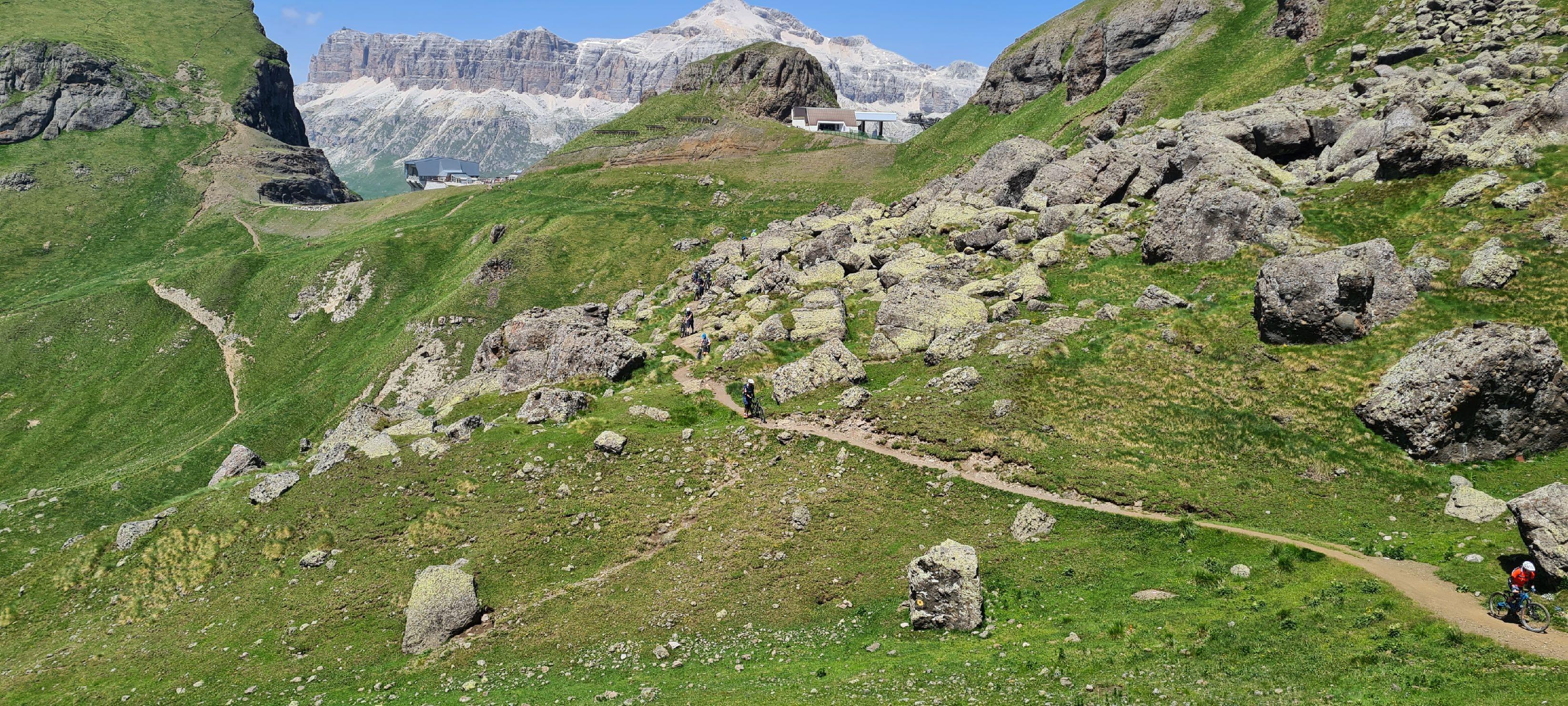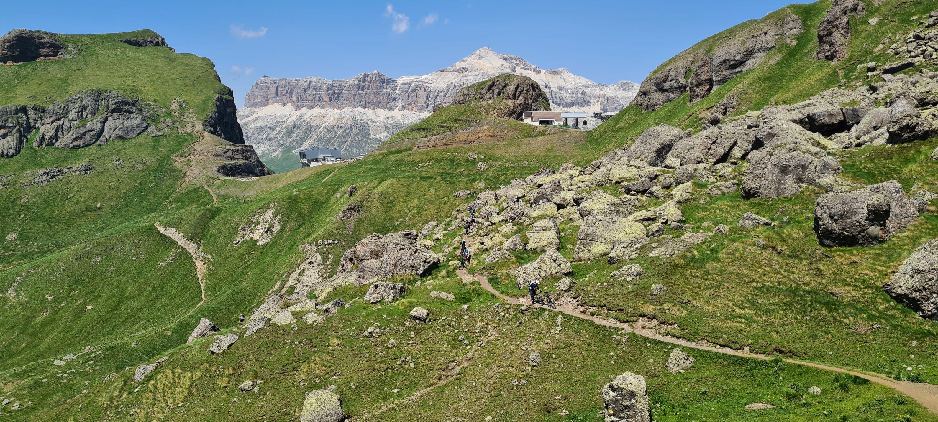 Die Höhepunkte reißen auch heute nicht ab. Wir kommen dem Gletscher der Marmolata immer näher. Der Start ist bereits mitten in der Felsarena. Mehr Panorama als beim Aufstieg zur Pralongia ist kaum möglich. Wir sind umringt von vielen namhaften Dolomitengipfeln. Nach 600 Höhenmetern erreichen wir die Pralongia Hütte. Bei einem Cappuccino auf der Hütte können wir den Ausblick kaum fassen. Nach der Hütte wurde eine neue Bikestrecke angelegt. Der Fle Trail führt uns über Brückenelemente hinunter. Über einen einzigartigen Höhenweg erreichen wir danach den Campolongo Pass. Er bildet die Grenze ins Veneto. Eine kurze, teils technische Abfahrt und wir sind im Skiort Arabba. Die Seilbahn bringt uns wieder in hochalpine Regionen: Die