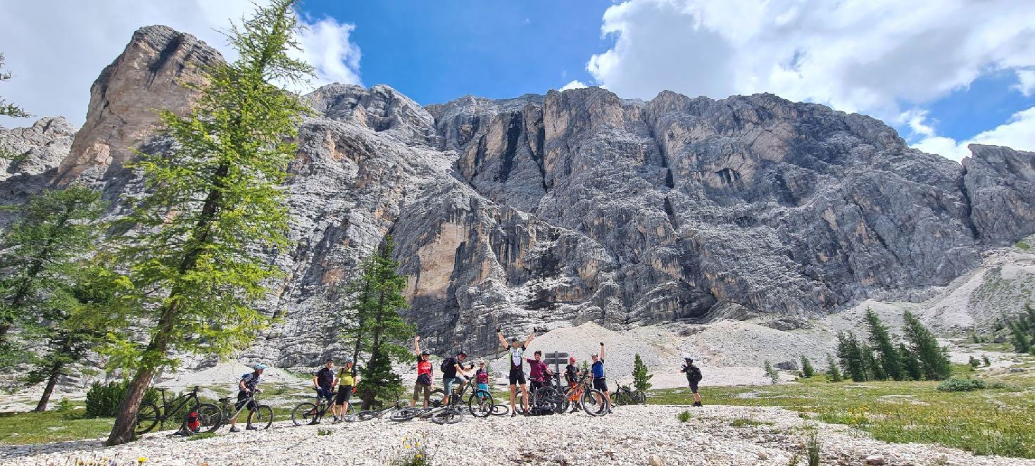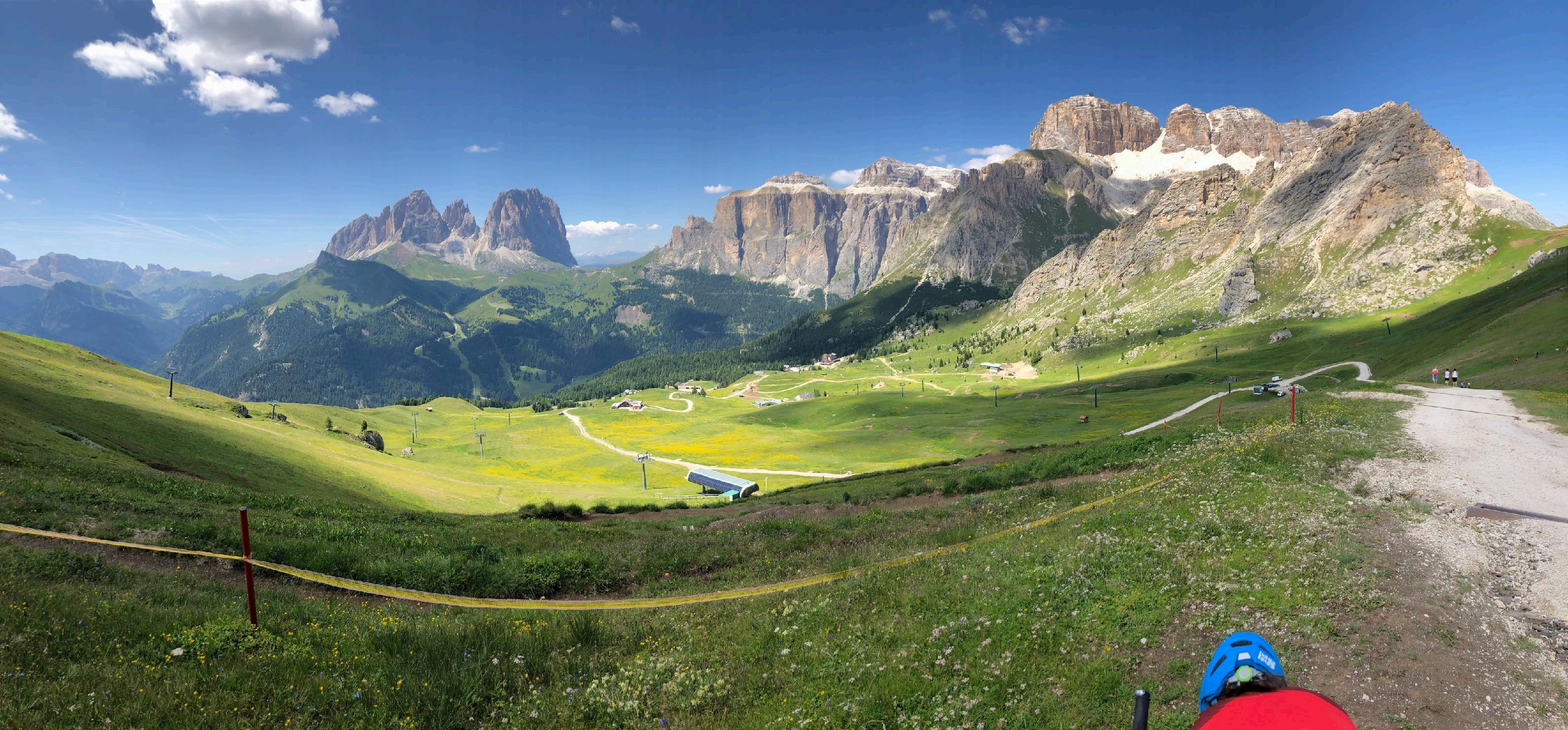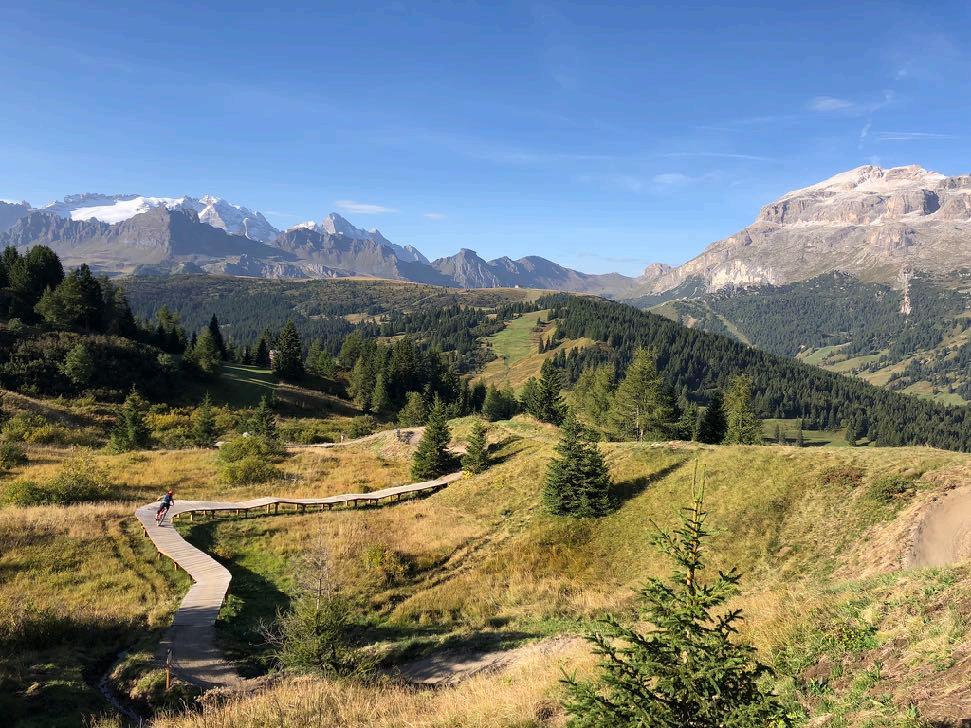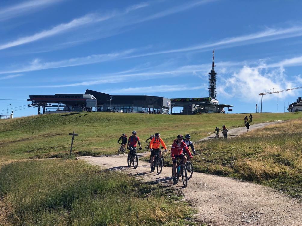 Die Höhepunkte reißen auch heute nicht ab. Wir kommen dem Gletscher der Marmolata immer näher. Der Start ist bereits mitten in der Felsarena. Mehr Panorama als beim Aufstieg zur Pralongia ist kaum möglich. Wir sind umringt von vielen namhaften Dolomitengipfeln. Nach 600 Höhenmetern erreichen wir die Pralongia Hütte. Bei einem Cappuccino auf der Hütte können wir den Ausblick kaum fassen. Nach der Hütte wurde eine neue Bikestrecke angelegt. Der Fle Trail führt uns über Brückenelemente hinunter. Über einen einzigartigen Höhenweg erreichen wir danach den Campolongo Pass. Er bildet die Grenze ins Veneto. Eine kurze, teils technische Abfahrt und wir sind im Skiort Arabba. Die Seilbahn bringt uns wieder in hochalpine Regionen: Die