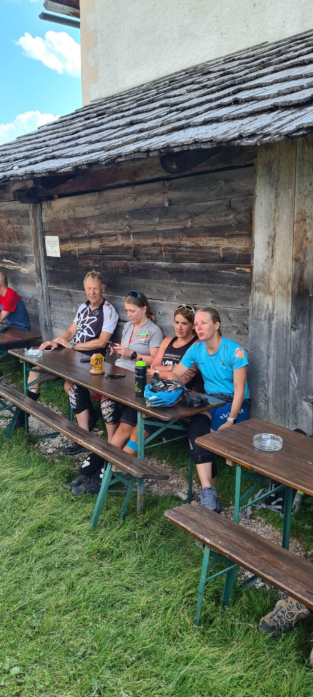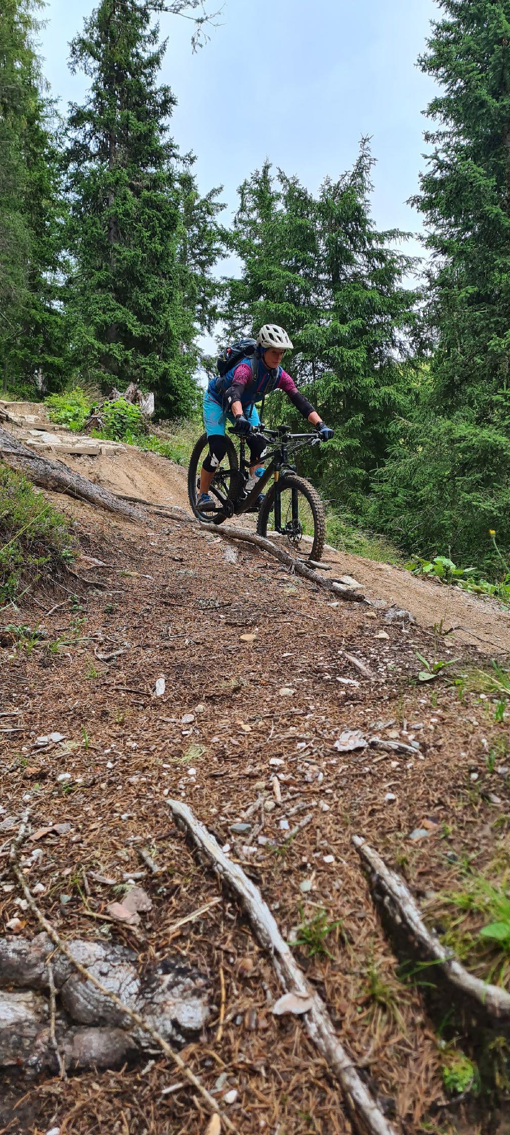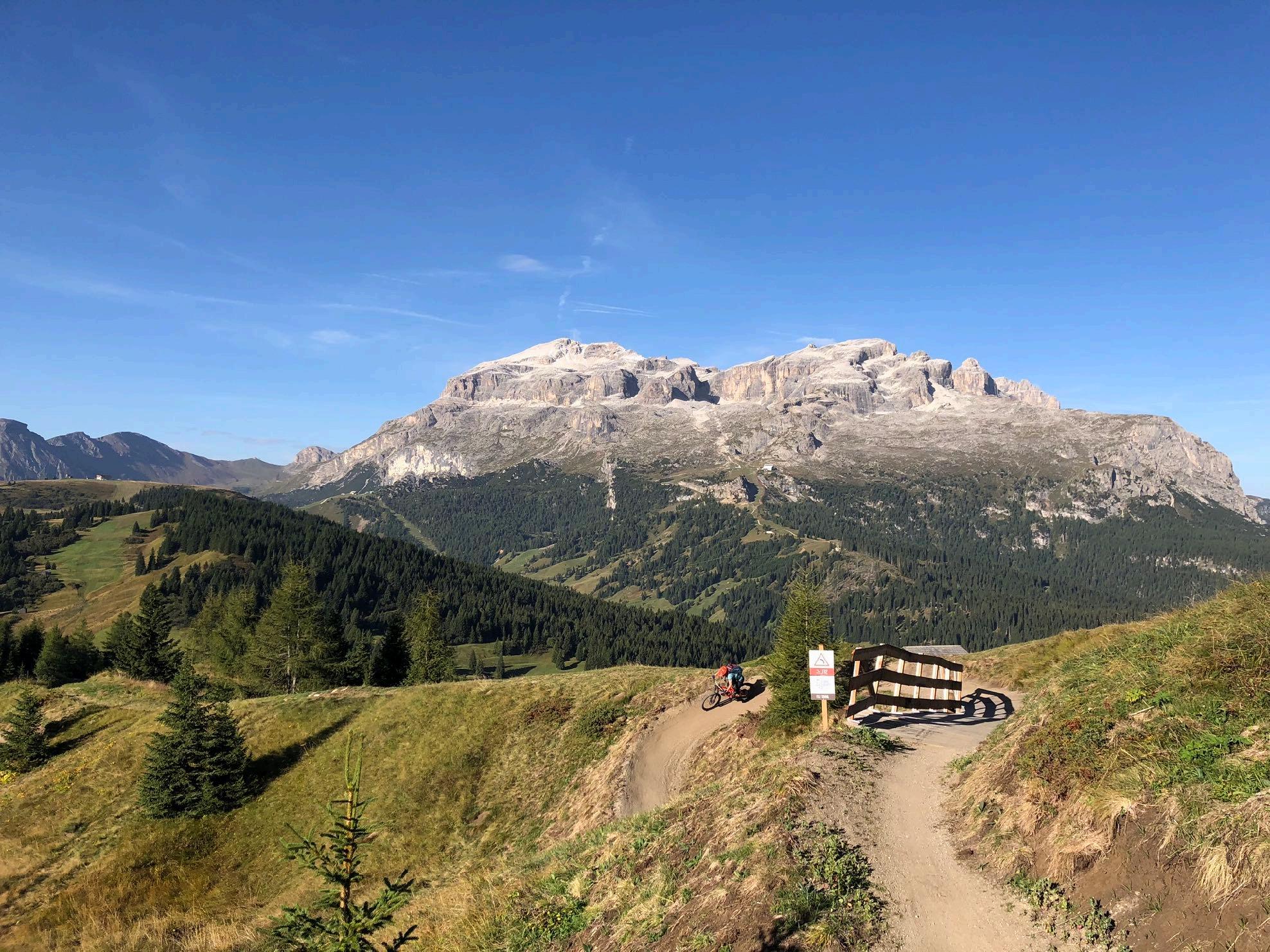 Knackig bergauf ist das Motto der ersten Stunde. Die Schotterstrasse hoch zur Pralongia ist teils steil, der Untergrund jedoch bestens. So sollte jeder Anstieg sein. Nach der Cappuccino-Pause nehmen wir den Fle Trail mit seinen vielen Brückenelementen. Dieser mündet in einen herrlichen Waldtrail bis zum Pass Campolongo. Der Trail führt im leichten bergauf und später dann auch kurz steil bergab zur Passhöhe. Danach kurz auf der Strasse weiter und dann nochmals teils ruppig bergab bis nach Arabba. Auf der 2500 Meter hoch gelegenen Porta Vescovo sind wir mitten im felsigen Hochgebirge. Ein schmaler Pfad direkt unter Felsen und am steilen Hang führt uns Richtung Mittagspause. Einige Passagen müssen geschoben werden. Nach der Hütte wird der Weg deutlich breiter. Am Fedaia Stausee können wir einige Minuten das geniale Panorama genießen. Danach folgt eine teilweise sehr anspruchsvolle Abfahrt ins Fassatal. Zum Schluss über Naturwege und kurze Asphaltroller bis direkt nach Canazei. Erst hier spuckt uns der Wald aus.