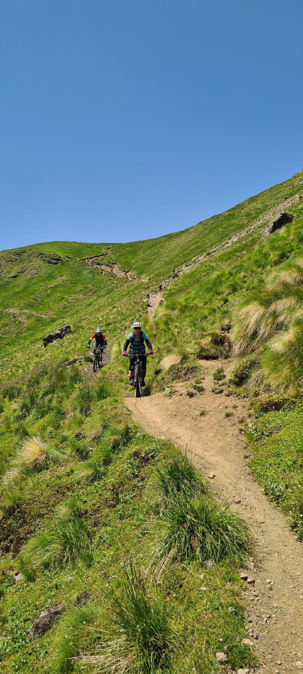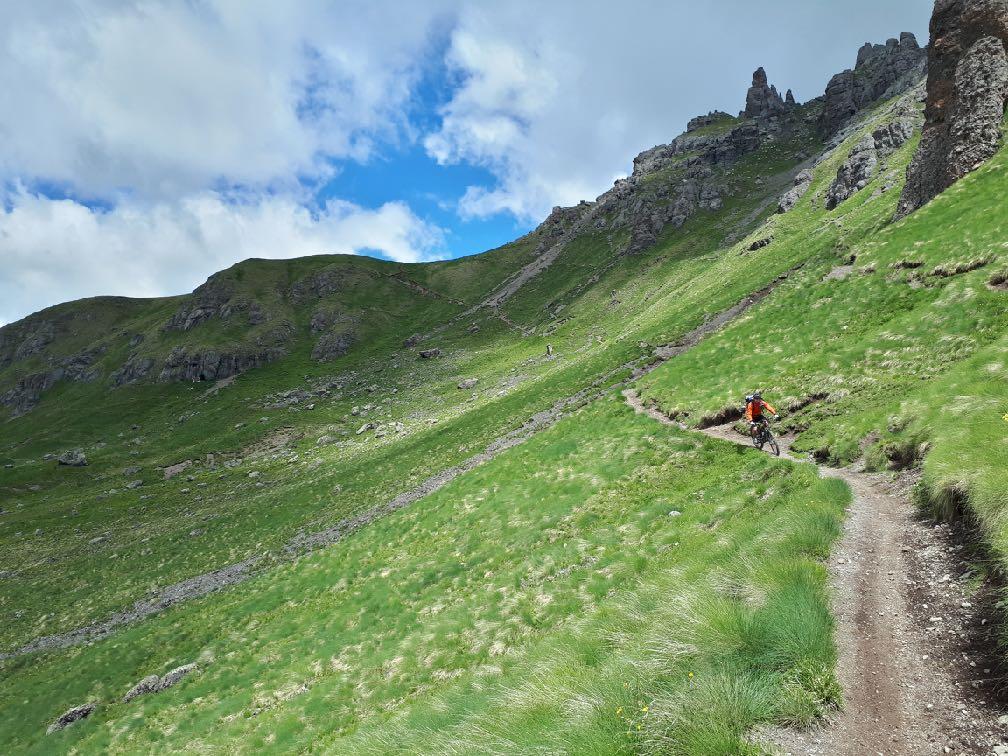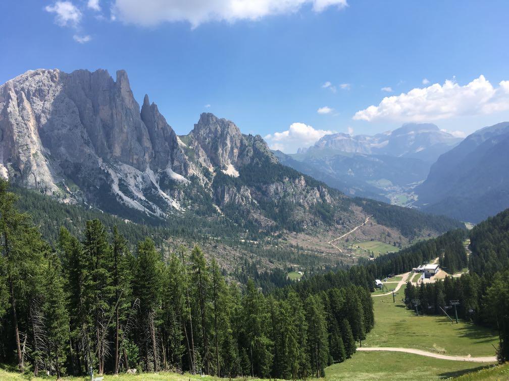 Knackig bergauf ist das Motto der ersten Stunde. Die Schotterstrasse hoch zur Pralongia ist teils steil, der Untergrund jedoch bestens. So sollte jeder Anstieg sein. Nach der Cappuccino-Pause nehmen wir den Fle Trail mit seinen vielen Brückenelementen. Dieser mündet in einen herrlichen Waldtrail bis zum Pass Campolongo. Der Trail führt im leichten bergauf und später dann auch kurz steil bergab zur Passhöhe. Danach kurz auf der Strasse weiter und dann nochmals teils ruppig bergab bis nach Arabba. Auf der 2500 Meter hoch gelegenen Porta Vescovo sind wir mitten im felsigen Hochgebirge. Ein schmaler Pfad direkt unter Felsen und am steilen Hang führt uns Richtung Mittagspause. Einige Passagen müssen geschoben werden. Nach der Hütte wird der Weg deutlich breiter. Am Fedaia Stausee können wir einige Minuten das geniale Panorama genießen. Danach folgt eine teilweise sehr anspruchsvolle Abfahrt ins Fassatal. Zum Schluss über Naturwege und kurze Asphaltroller bis direkt nach Canazei. Erst hier spuckt uns der Wald aus.