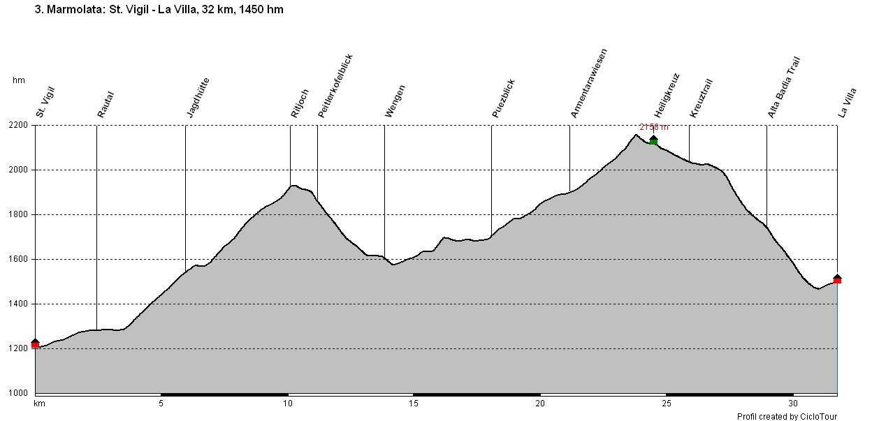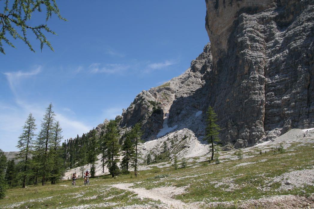 Mit einer Waldauffahrt von 600 Höhenmetern beginnt der heutige Tourentag. Der Schotterweg birgt keine fahrtechnischen Tücken. Auch vom Ridjoch hinunter nach La Val bleiben wir auf gut befestigten Schotterwegen. Danach geht es weiter auf Schotterwegen zu den Armentara Wiesen. Eine kurze, aber knackige Rampe und wir sind am Fuß des Heiligkreuzkofels. Strecke und Panorama sind phantastisch, doch der Anstieg zieht sich immer mehr. Der Schotterweg wird zum Höhenpfad. Kurze Schiebepassagen lassen sich nicht vermeiden. Glücklicherweise ist am Ende das Kirchlein von Heiligkreuz zu sehen und damit die verdiente Mittagspause. So kann jeder sein Tempo fahren. Die Abfahrt führt dann weiter am KreuzkofelMassiv entlang und ist teilweise technisch, aber für den guten Level 3 Fahrer Genuß pur. So muss Mountainbiken sein. Die letzten Kilometer auf Schotter und Asphalt rollen wir bis zum Hotel nach La Villa.