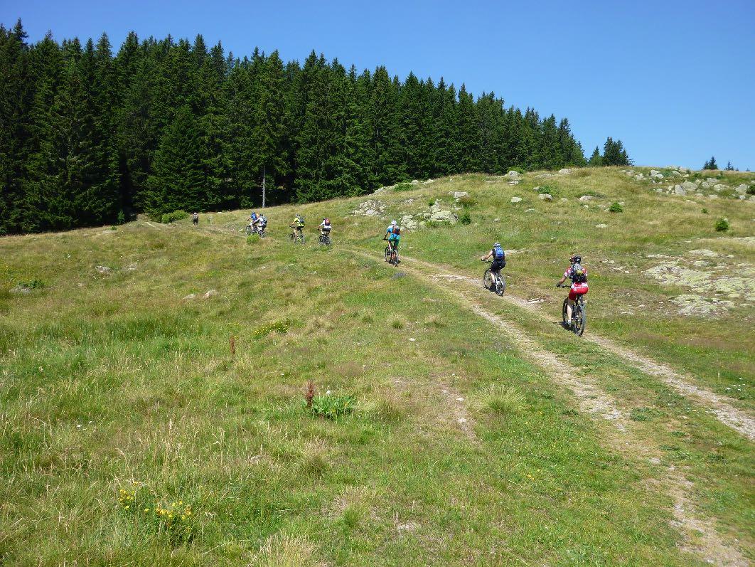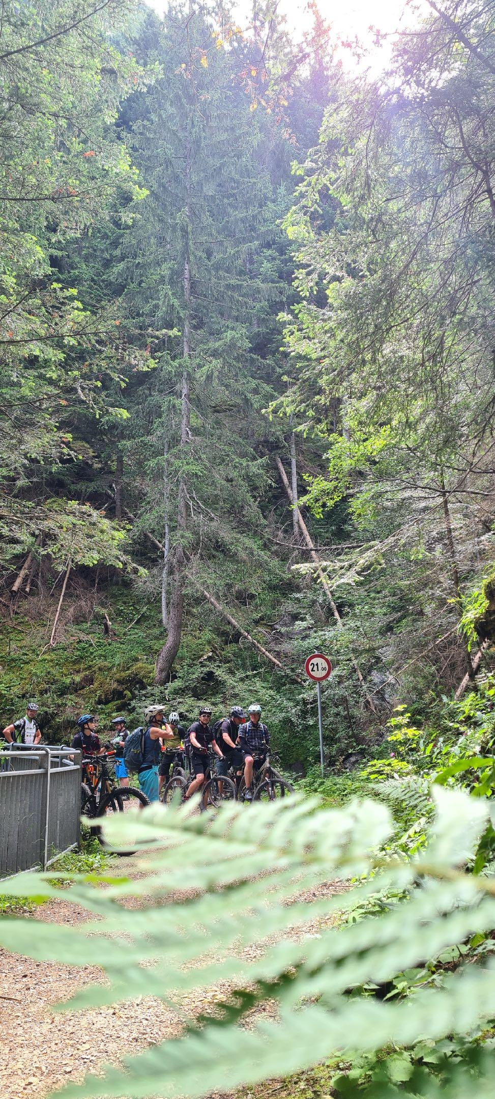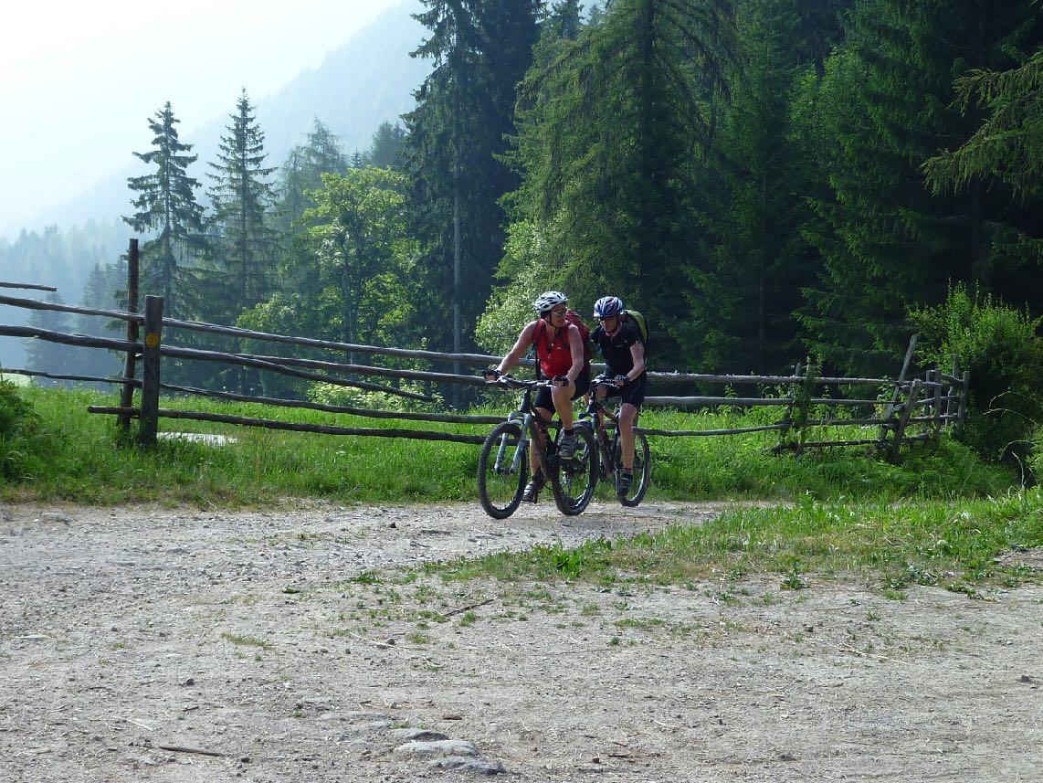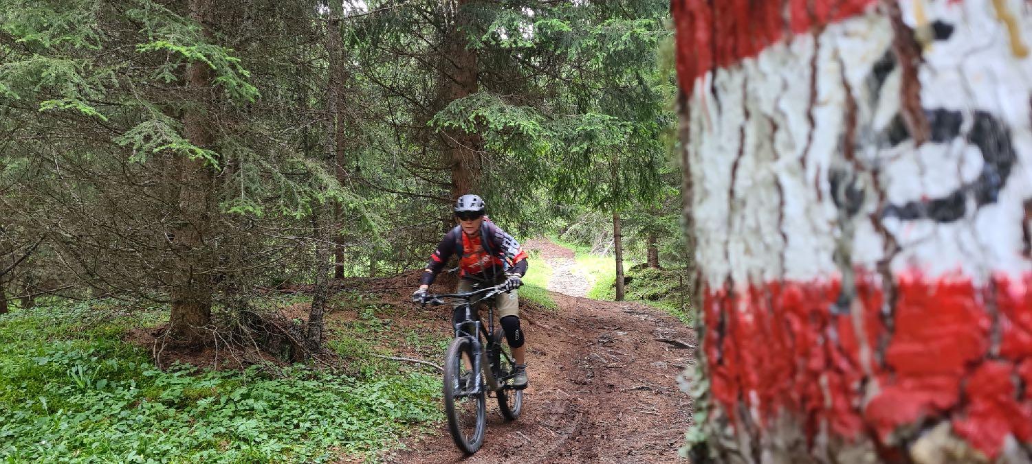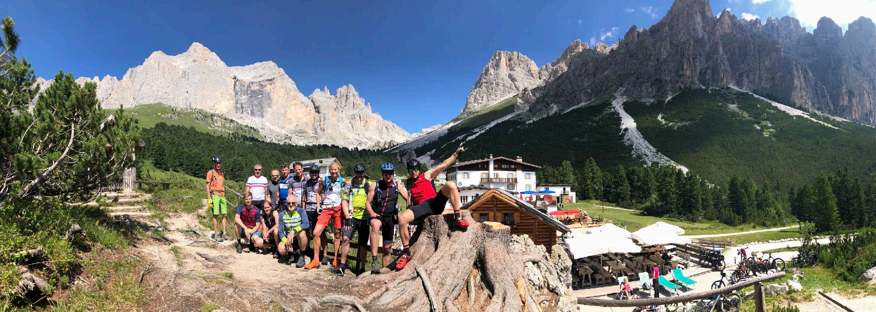 Bergauf bergauf ist das Motto des heutigen Vormittags. Zunächst durch einen tollen Wald Richtung Obereggen. 100 Höhenmeter bis in den Skiort. Danach sausen wir eine Asphaltbahn hinunter, um dann im Wald den wahren Charakter eines steilen Kreuzwegs zu erfahren. Anfänglich ständig bergauf und ab, später dann nur noch ansteigend. Doch die Steigung wird zur Cappuccino-Pause moderater und erst unterhalb des Gipfels des Weißhorns wechseln sich im letzten Stück steilste Passagen und knifflige Schotterstücke ab. Die eine oder andere Stelle müssen manche schieben. Nach der Mittagspause geht es überwiegend auf guten Schotterwegen und alten Karrenwegen bergab. Als kurze Einlagen überraschen Südtiroler Trails. Ein letzter Asphaltanstieg und wir haben es geschafft.