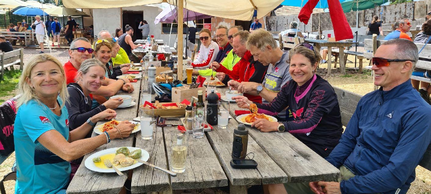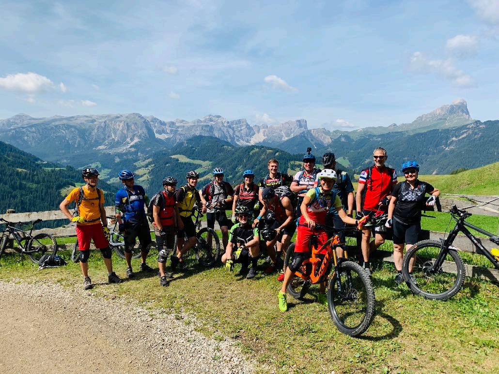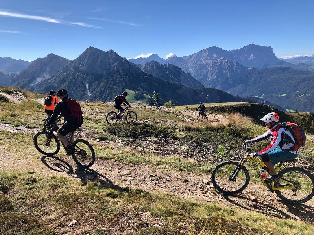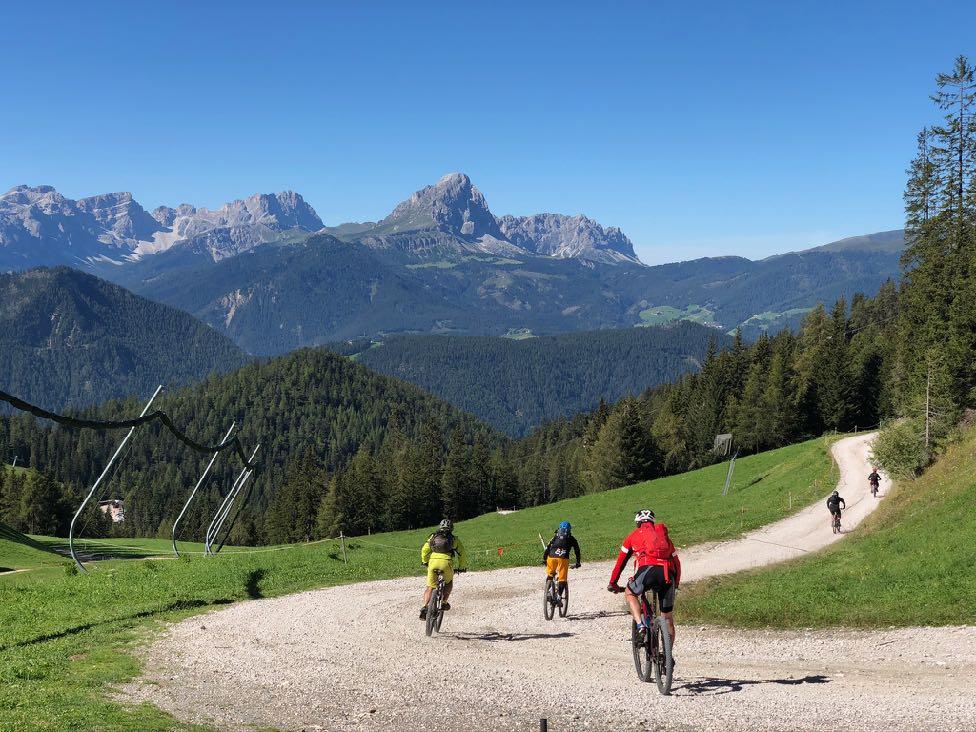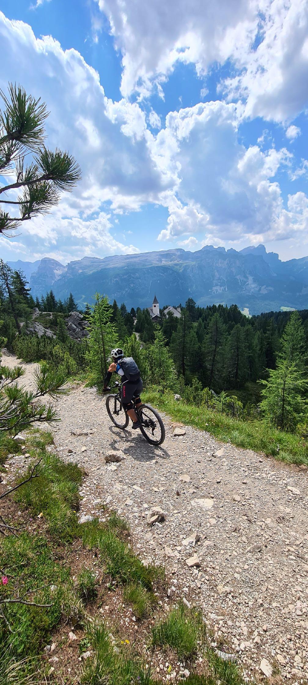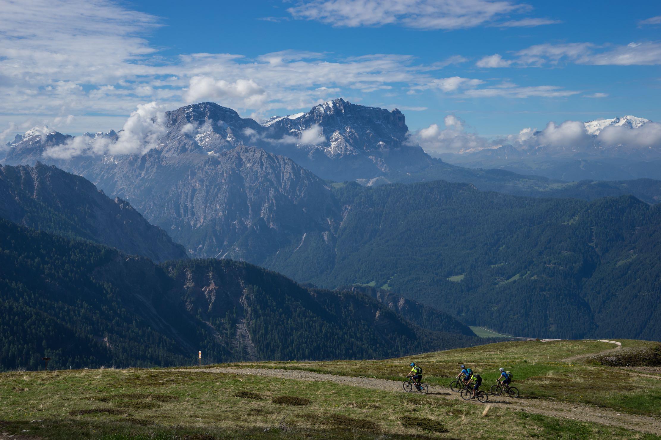 eine Mittagspause verdient. Die Sicht von unserem Rifugio ist dann regelrecht überwältigend. Der Alpenhauptkamm liegt uns zu Füßen. Nach der Mittagspause fahren wir noch die letzten Höhenmeter bis zum Gipfel, vorbei am Messner Mountain Museum und dem Einstieg in den Furcia-Trail. Wir drehen eine komplette Runde und erleben den 360 Grad Bergblick mehr als intensiv. Danach beginnt der schönere Teil des Tages. Wir genießen die ersten Trails der Tour am Kronplatz. Ab dem Furkelpass rauschen wir kurz die Strasse bergab bevor uns ein letzter schöner Trail nach St. Vigil führt. Von hier sehen wir bereits den SennesFanes Naturpark. Nur noch wenige Kilometer trennen uns von unserem Tourenziel St. Vigil. Unser Hotel heißt Biker willkommen. Wir entspannen mit Apero, Saunalandschaft und beim Blick vom Garten auf den Hausberg St. Vigils.