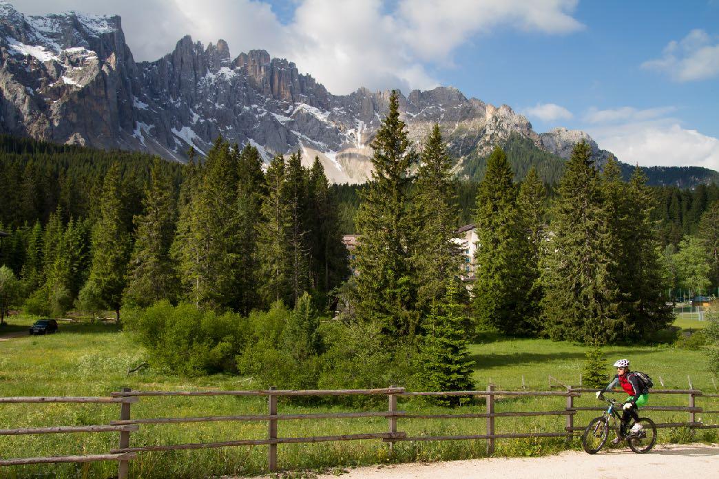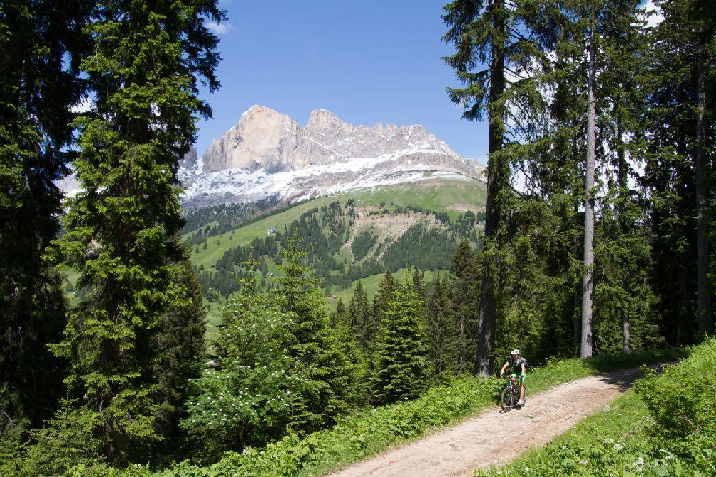 Zwei Anstiege prägen den Tag. Zunächst sausen wir jedoch nach Canazei und am Fluß entlang eine gute halbe Stunde talauswärts durch den Wald. Eine teils steile Skipistenabfahrt führt uns direkt in den Wintersportort. Den Anstieg hoch zu den Vajolet-Türmen meistern wir auf einem gesperrten Asphaltweg. Jeder kann hier sein Tempo fahren, denn oben wartet bereits der Cappuccino. Ein herrlicher Höhenweg ohne fahrtechnische Schwierigkeiten bringt uns zur Mittagsrast. Die Abfahrt danach ist zunächst eine steile Schotterpiste, danach ein anspruchsvoller Singletrack. Im Anstieg zum Karer Pass können wir ein kurzes Stück der Passstraße nicht vermeiden, ehe wir wieder auf schmalen Wegen den Karerpass ansteuern. Danach folgt nur Genuss auf Waldwegen bis zum Hotel am Karer See.
