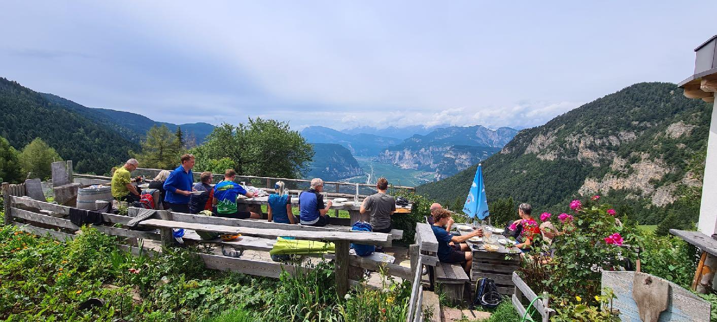 Höhenmeter und Fahrspaß prägen den Tag heute gleichermaßen. Mit einer herrlichen Waldauffahrt erklimmen wir das Trudener Horn. Noch einmal tauchen am Horizont weit hinter uns die Dolomiten auf. Vor uns dagegen liegen schon die Berge des Gardasees. In drei Etappen erreichen wir die Alm. Wieder genießen wir den Cappuccino in luftiger Höhe. Noch ein kurzes Schiebestück über den Sattel und wir sehen ins Etschtal hinein. Von Bozen über Gantkofel, Monte Roen, Mendelpass, Kalterer See bis beinahe Trient reicht unser Blick. Die italienischen Dörfer rücken immer näher. Zuvor kehren wir allerdings in einem herrlichen Südtiroler Berggasthaus ein. Die Wirtin verarbeitet überwiegend eigene Produkte. Nach dem Genuß von Pasta-Tris und Apfelstrudel ist das Urteil klar: Besser haben