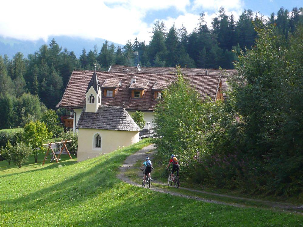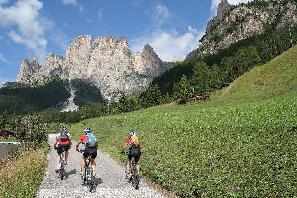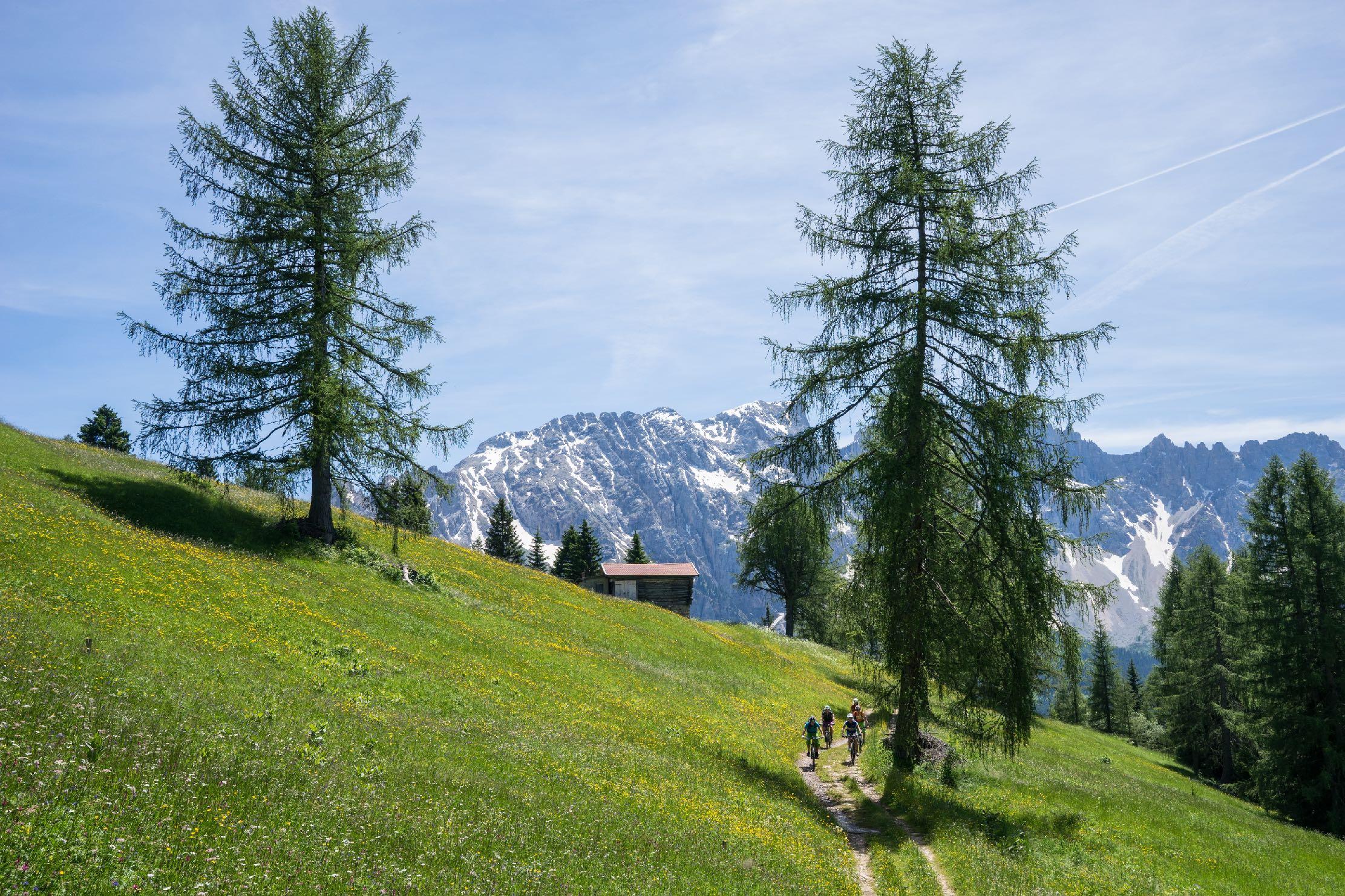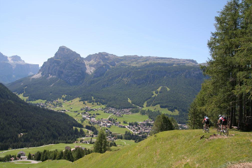 Wir sind schon mittendrin in den weißen Berggiganten. Am Morgen rollen wir Richtung Pederü jedoch biegen wir vorher ab Richtung Ridjoch. Hier warten die ersten 600 Höhenmeter auf uns. Oben am Ridjoch angekommen, genießen wir den Blick auf das bekannte Fanes-Massiv. Neben Fanes ragen auch Peitlerkofel mit Geislerspitzen sowie die gesamte Puez-Gruppe heraus. Die Cappuccino-Pause ist beinahe kitschig. Das Panorama oberhalb von La Val schlägt einfach alles. Dennoch müssen wir weiter. Wir arbeiten uns über die Armentara Wiesen wieder hinauf und später direkt unterhalb der hoch aufragenden Kreuzkofel Wände. Hier lohnt nochmals eine kurze Rast. Über einen Steig erreichen wir unser Mittagsziel die Kirche von Heiligkreuz. Schöner kann eine Berghütte nicht liegen. Bis dahin haben wir bereits hart gearbeitet, also lassen wir uns Knödelsuppe und Kaiserschmarrn besonders schmecken. Wer will, hat sogar Zeit für einen kleinen Rundgang am Berg oder ein stilles Gebet in der Kapelle. An Plätzen wie diesem begreift man, warum das Wort Frömmigkeit in den Bergen eine ganz andere Bedeutung hat. Danach beginnt wieder ein Sahnestück für begeisterte Mountainbiker. Es geht teils technisch bergab bis ins Hotel nach La Villa. Diese Abfahrt wird kein Teilnehmer so schnell wieder vergessen. Wenn uns der Wald entlässt erwartet uns nochmals ein toller Blick auf das Gadertal in der Abtei Badia. Wir sind noch immer oberhalb von La Villa. Imposanter kann ein Mountainbiketag nicht sein. Im Wellness-Bereich können wir perfekt entspannen, danach klingt der Tag bei einem stilvollen Abenddinner aus.