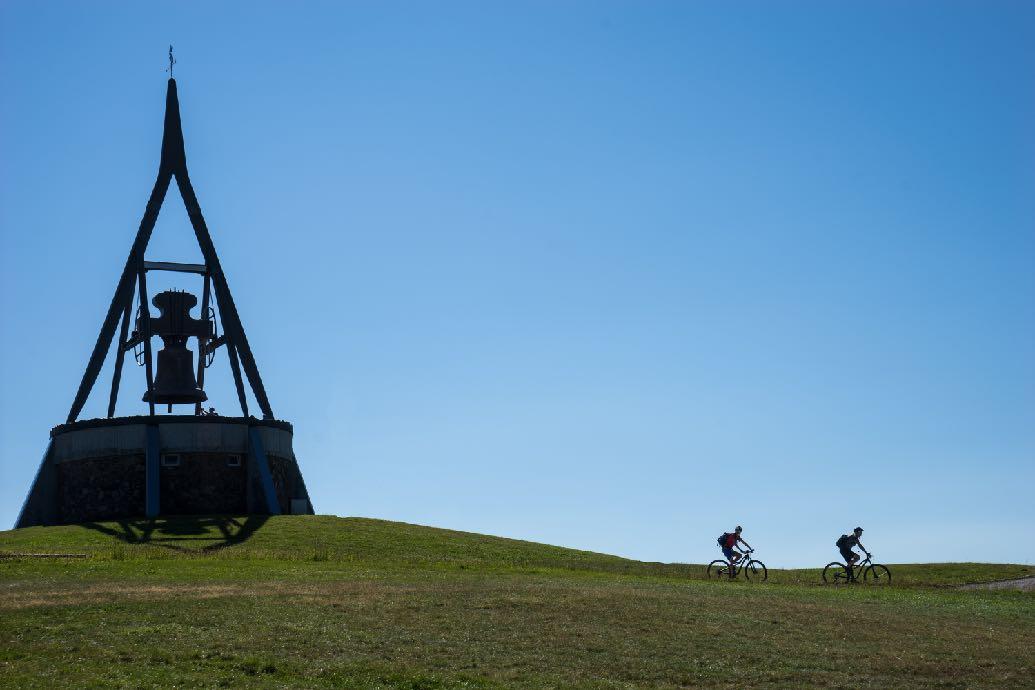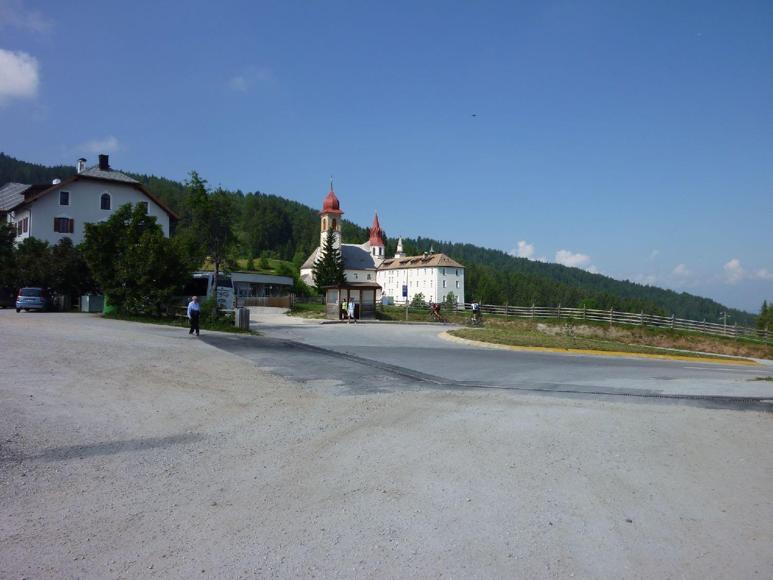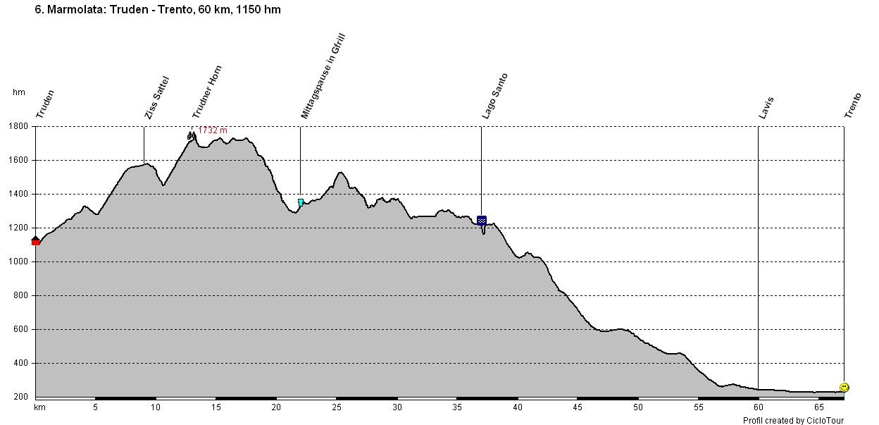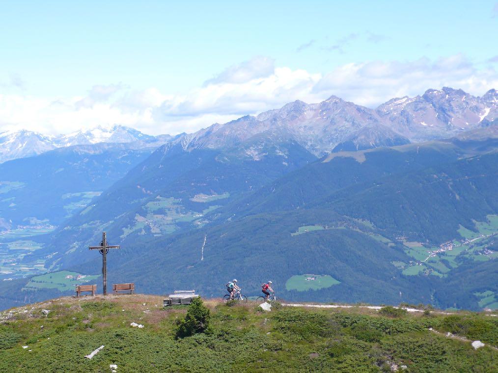 men wir danach an die Flanken des Weißhorns heran. Lärchen und Wegkreuze säumen den Weg. Ein steiler Anstieg und der Blick wird plötzlich frei. Wir sind 2000 Meter hoch. Über einen letzten kurzen Anstieg erreichen wir das Jochgrimm. Hinter uns die Dolomiten, vor uns die Gipfel von Schwarzhorn und Weißhorn. Die Panorama-Tische bei unserer Mittagsrast sind reserviert. Wir genießen die Südtiroler Sonne und den Ausblick. Auch hier möchte man länger rasten aber nach dem Nachtisch müssen auch wir weiter. Auf unterschiedlichen Wegen geht es dann hinunter nach Radein. Ab Kaltenbrunn klettern wir nochmals 200 Höhenmeter hinauf in das Bergdorf Truden. Wir übernachten in einem kleinen Familienhotel. Wieder klingt ein herrlicher Biketag gemütlich aus. Morgen verlassen wir die Dolomiten und erreichen Trento.