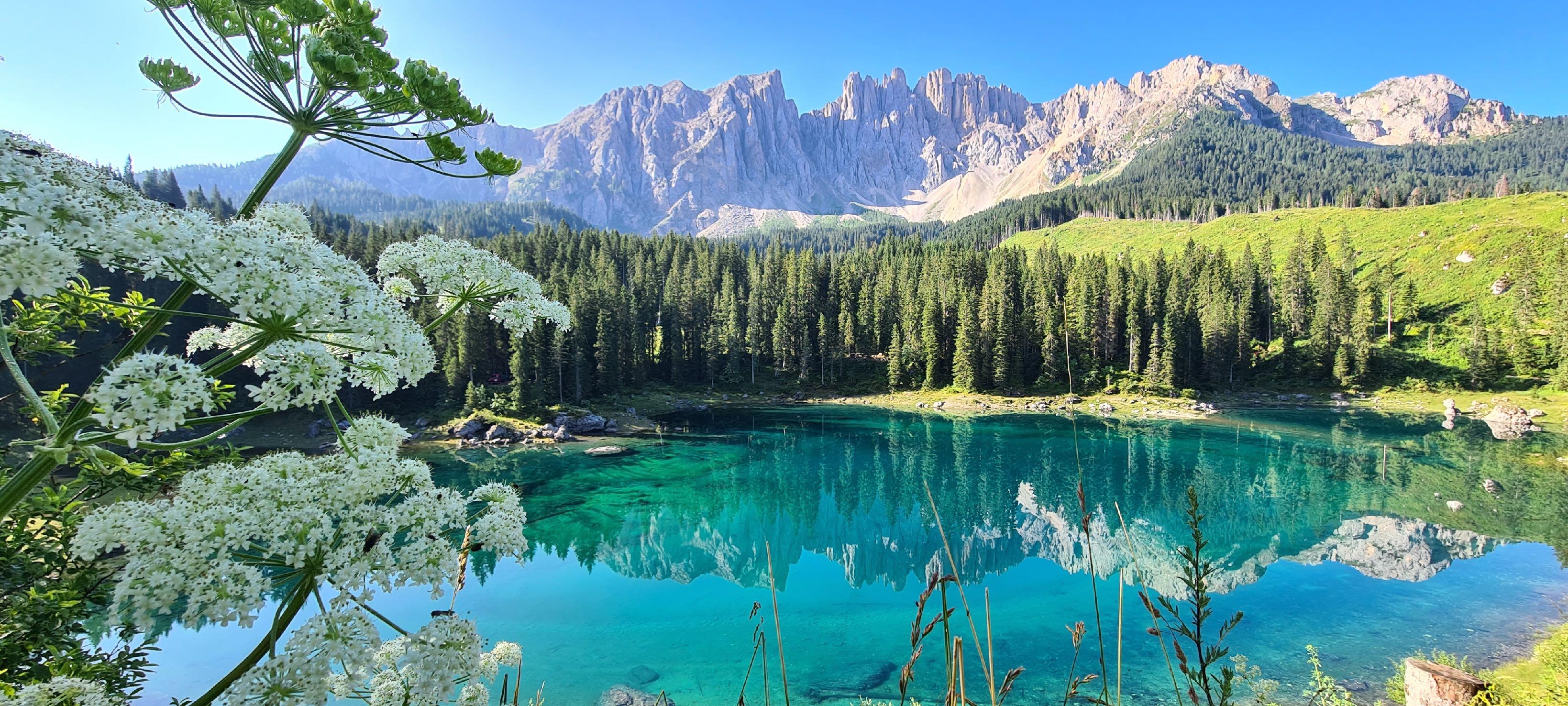 nach. Wir erreichen ein kleines Kirchlein und nun folgt der 2. Anstieg des Tages bis zum Karerpass. Doch schneller als gedacht sind auch diese Höhenmeter geschafft. Einen Teil dazu müssen wir jedoch auf der Passstrasse leisten. Für die letzten Höhenmeter verlassen wir diese und sind schnell wieder auf besten MTB-Strecken unterwegs. Und plötzlich taucht der Latemar vor uns auf. Zunächst noch auf der Seite des Rosengartens wechseln wir am Karerpass die Fahrtrichtung und passieren an den Flanken des mächtigen Latemar nun den Karer See. Wie ein Juwel liegt er inmitten dieser schönen Berge. Auch der Rosengarten zeigt sich nochmal in seiner vollen Pracht. Im beginnenden Nachmittagslicht sogar von seiner schönsten Seite. In unserem Hotel lassen wir es uns so richtig gut gehen. In den Loungesesseln blicken wir direkt zum Latemar oder erholen uns in der Sauna des Hauses. Der Alltag ist weit, weit weg.