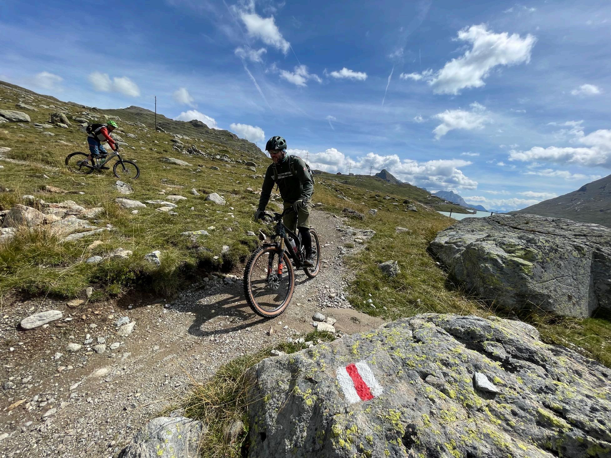Auf neu gebauten Bikepark-Wegen geht es teils technisch und schweißtreibend gut 200 Höhenmeter weiter hoch bis zur Forcola Minor. Der knapp einstündige Anstieg kostet Kraft, lohnt aber jede Mühe. Der Ausblick ist gigantisch. Direkt vor uns ragt der Bernina Gletscher auf, tief unter uns liegen die zwei Gletscherseen. Der legendäre Bernina-Express gleicht von hier oben einer Spielzeug-Eisenbahn. Es folgt