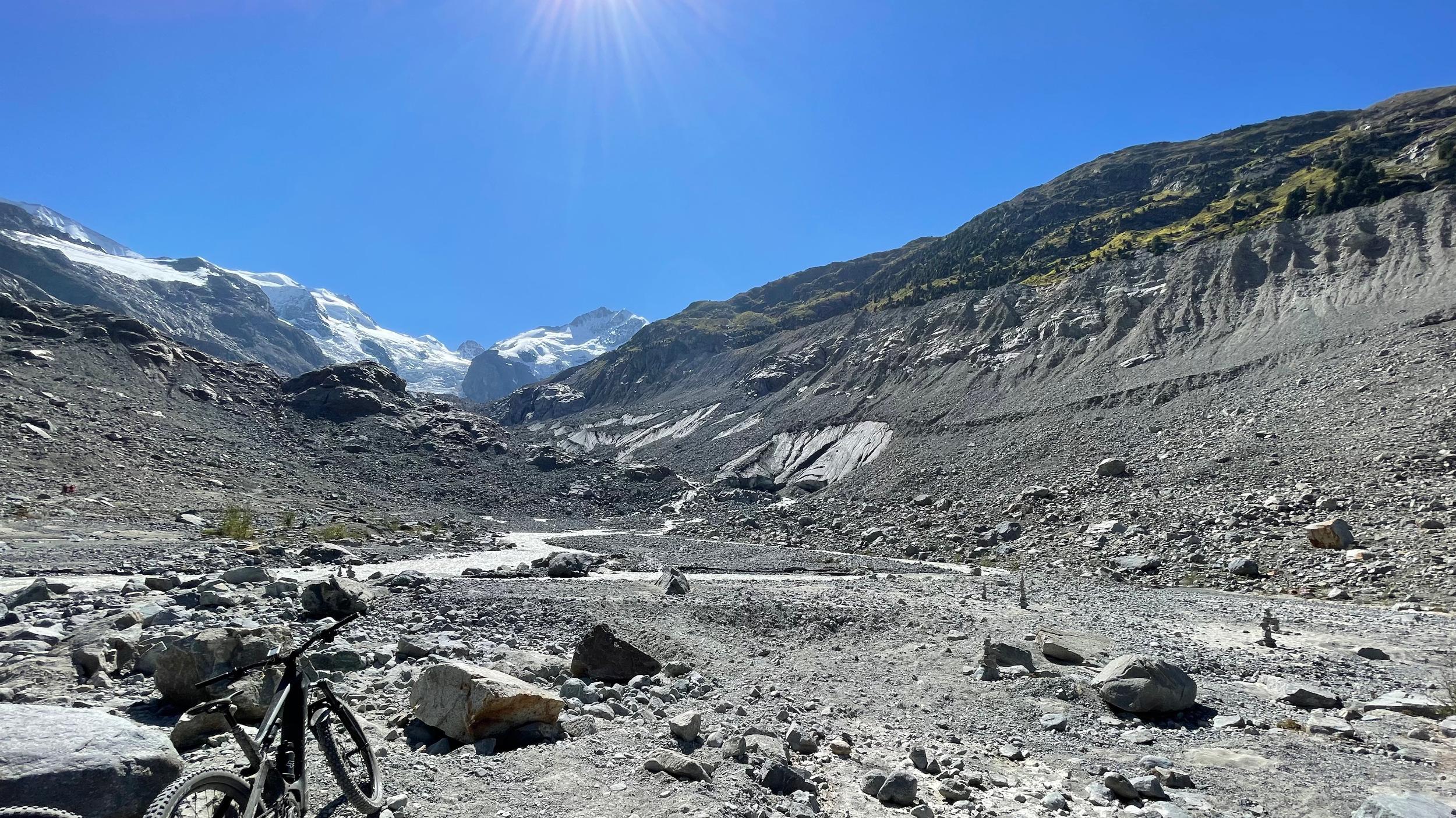 Schneller als gedacht ist der BerninaPass erreicht. Von da an geht es eigentlich nur noch bergab. Wir rasten mit Blick auf Diavolezza und Bernina Gletscher und gehen mit Spaß die Abfahrt an. Diese entpuppt sich als herrlichste Mountainbikestrecke mit netten Wegen in wahrer Postkartenlandschaft. Unvermittelt taucht dann der nächste Gigant auf. Waren wir eben noch ganz auf den Weg und einige Wurzeln konzentriert, schlägt uns jetzt der gewaltige Morteratschgletscher in seinen Bann. Wir lassen uns in einer urigen Käserei den verdienten Kuchen schmecken. Der Tag könnte immer so weiter gehen.