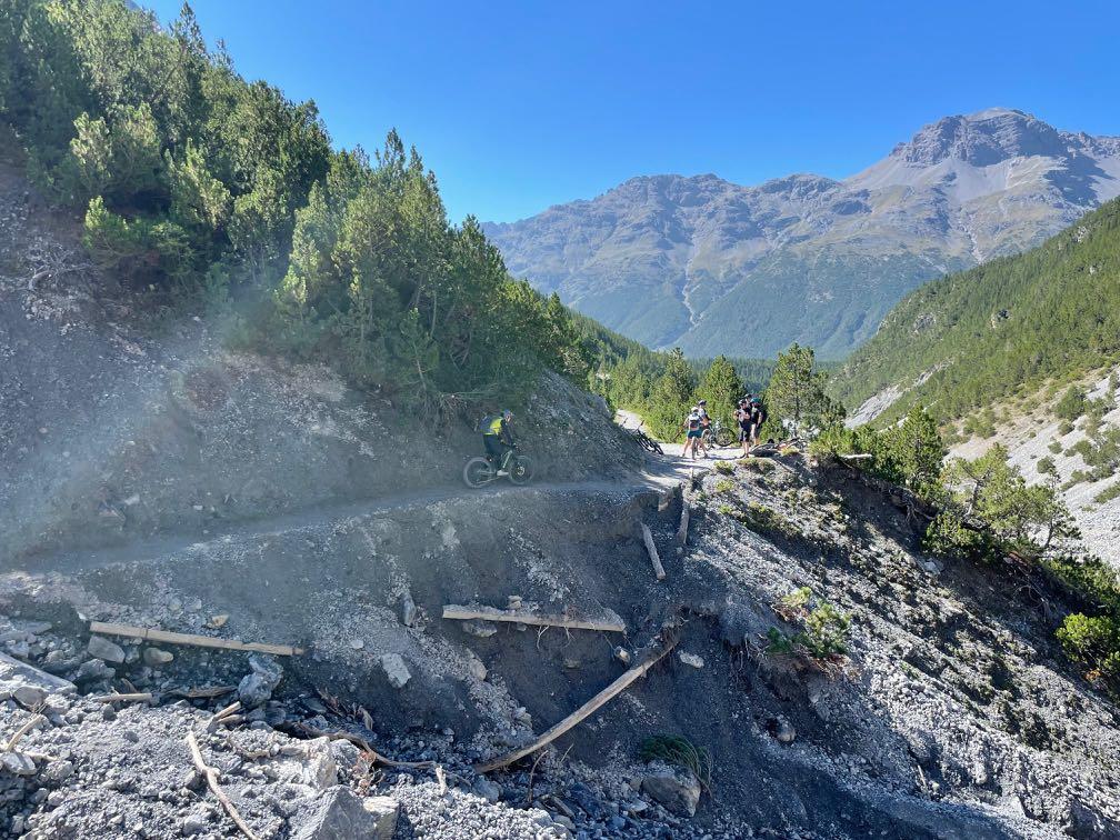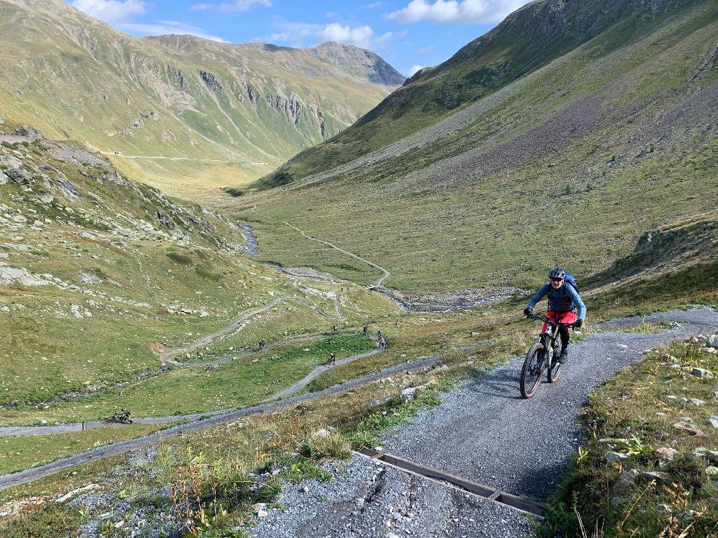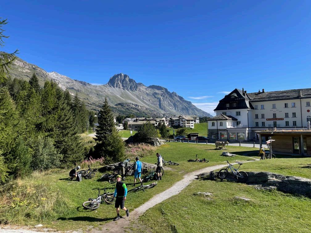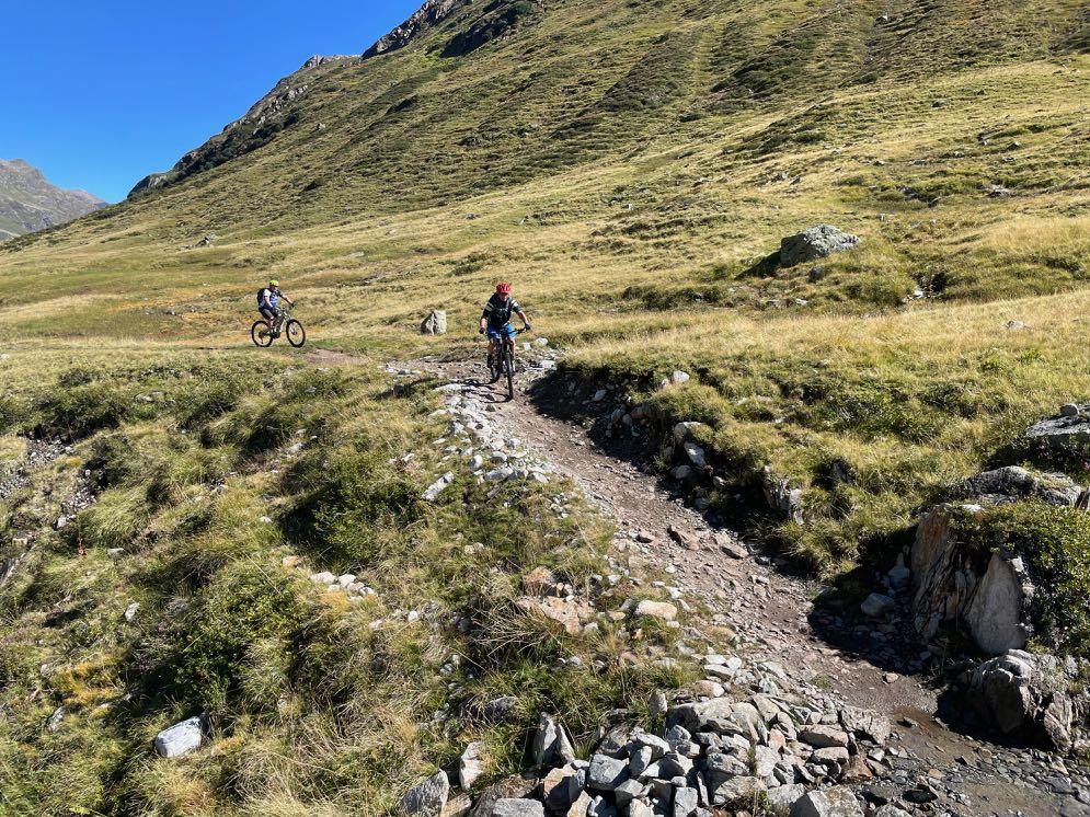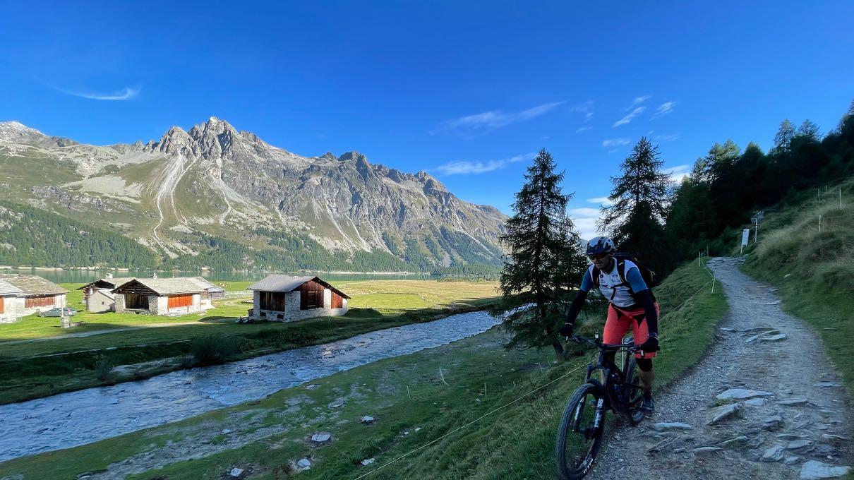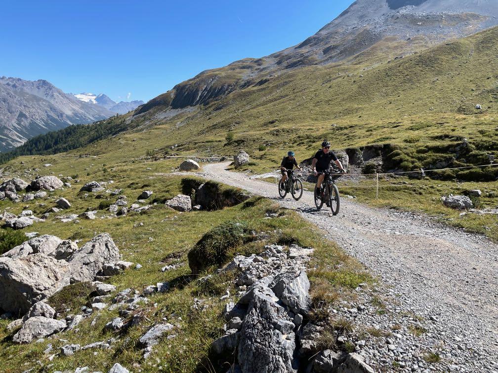 Die letzten Spitzkehren auf einem schmalen Pfad sind nur erste Herausforderung für unsere Kletterer in der Gruppe. Fahrbar, aber ganz schön steil. Danach geht es technisch und anstrengend weiter. Der Anstieg zum Val Minor wurde zwar für Biker gebaut, fordert aber alle Kräfte. Selbst Spitzkehren gilt es bergauf zu meistern. Von hier oben beginnt eine Traumabfahrt auf einem Naturtrail hinunter zum Bernina Pass. Legendär ist auch der Trail weiter bis nach St. Moritz hinab. Wir rollen auf Schotter, Waldwegen und teils wurzeligen Singletracks. Auch die letzten Meter entlang der beiden Seen sind herrlichste Mountainbike-Wege. Ein rundum schöner Tag.